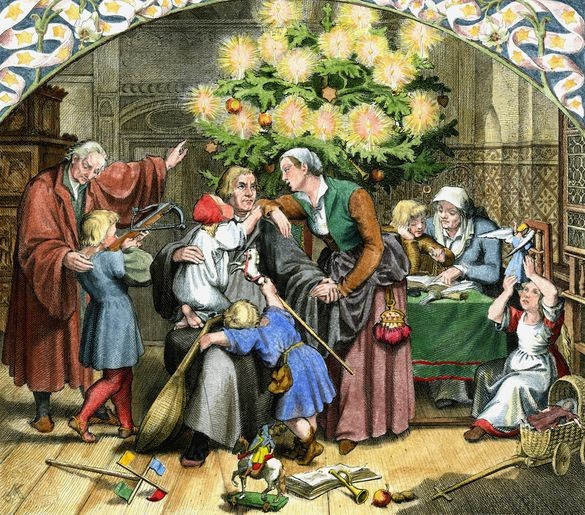 W ślad za ojcem protestantyzmu, niemieckie rodziny tego wyznania zaczęły więc kultywować praktykę strojenia drzewka na święta, a duchowni zalecali wiernym, by pojawiały się w tym czasie w ich domach zielone drzewka, symbolizujące nadzieję i odradzające się życie. Z początku choinka wieszana była czubkiem do dołu, pod powałą, dopiero później zaczęto ją stawiać na ziemi. Zawieszki z jabłek miały przypominać o grzechu pierworodnym, choć były też symbolem płodności. Najstarszy dokument ?wizualny? potwierdzający tę tradycję stanowi sztych łukasza Cranacha starszego z 1509 roku, na którym widzimy choinkę ozdobioną świecami.