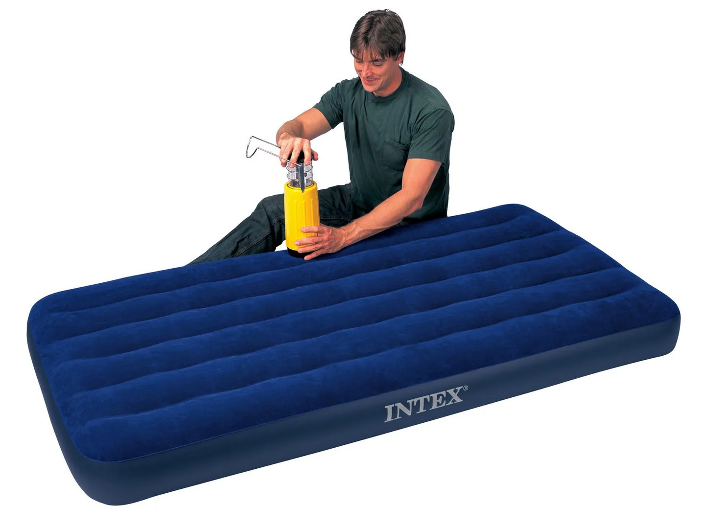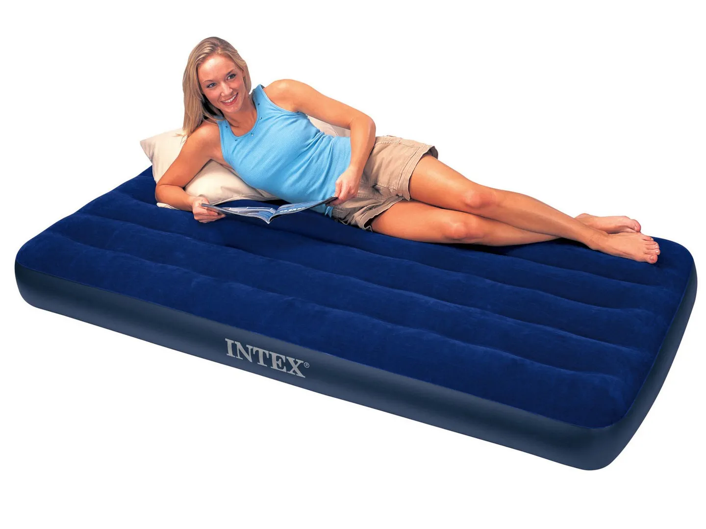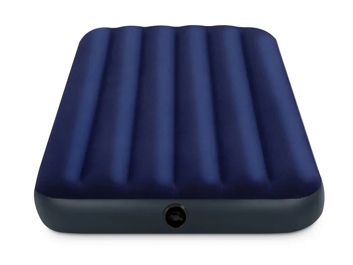 Materac welurowy Twin INTEX, o wymiarach 191 x 99 x 22 cm, prawie najmniejszy w serii, swoimi gabarytami zajmuje naprawdę niewiele miejsca. Wykonany z mocnego, wodoszczelnego tworzywa PVC, na górze został pokryty przyjemnym welurowym materiałem.