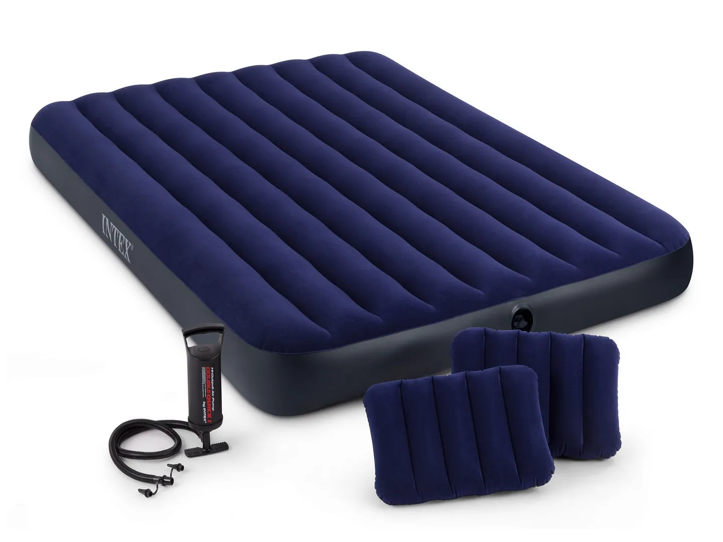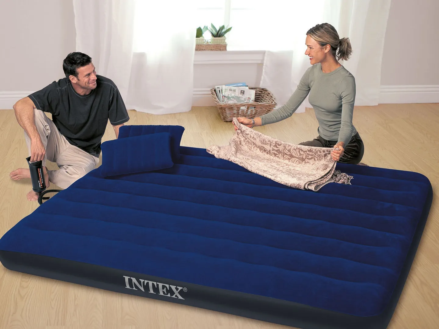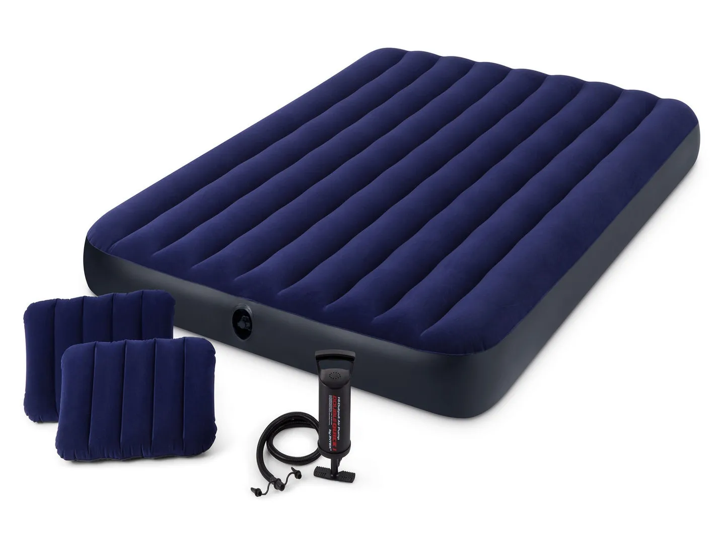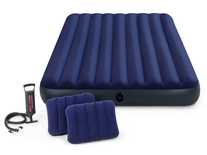 Całość w neutralnej granatowej kolorystyce nie będzie rzucała się w oczy, na tle umeblowanego mieszkania. Przenośne łóżko szybko będzie gotowe do użytku dzięki znajdującej się w zestawie pompce Intex, natomiast gdy nie będzie ono w danej chwili potrzebne, przy pomocy zaworu szybkiego spuszczania powietrza, wystarczy opróżnić materac, następnie złożyć i schować do szafy.