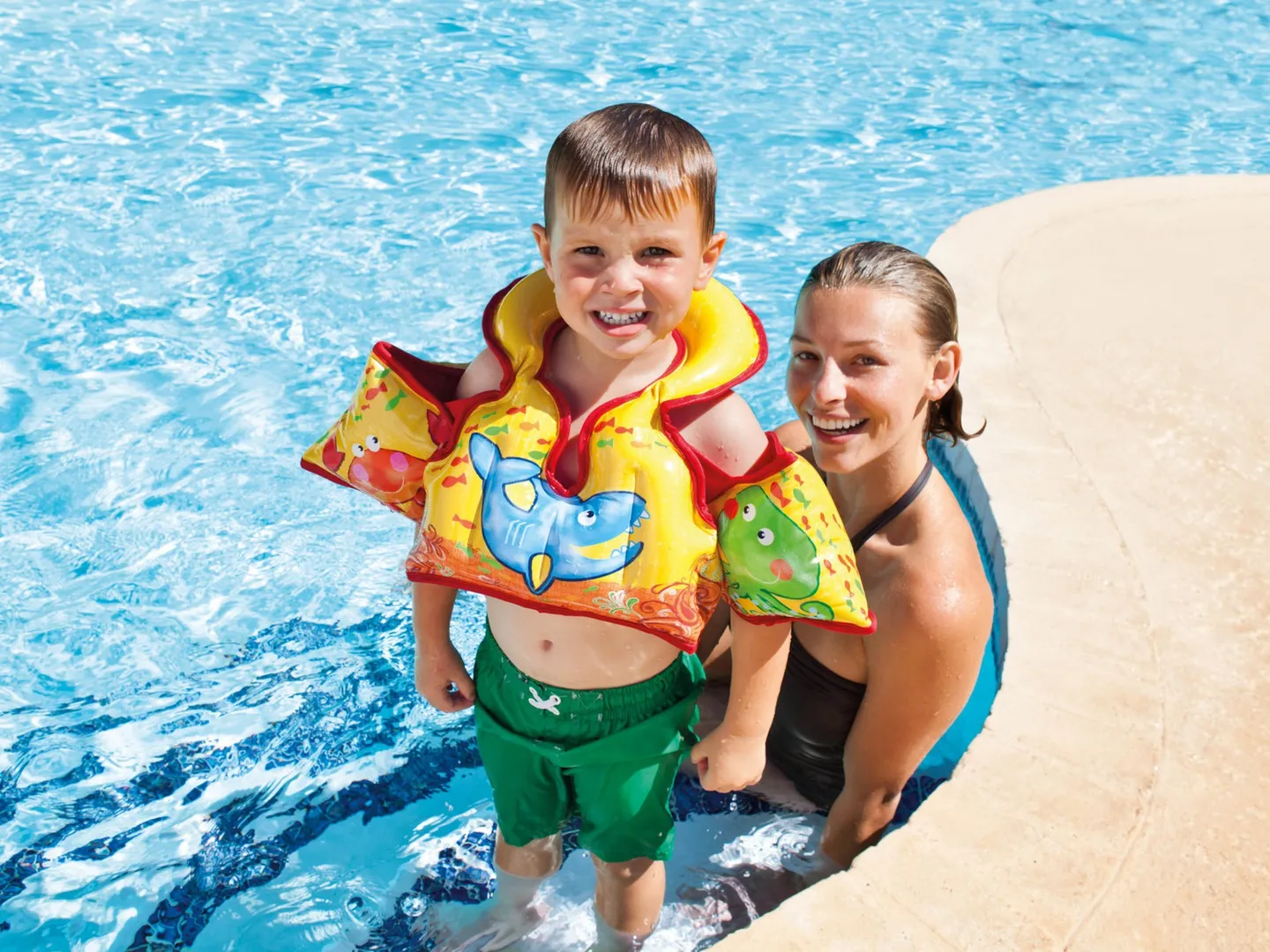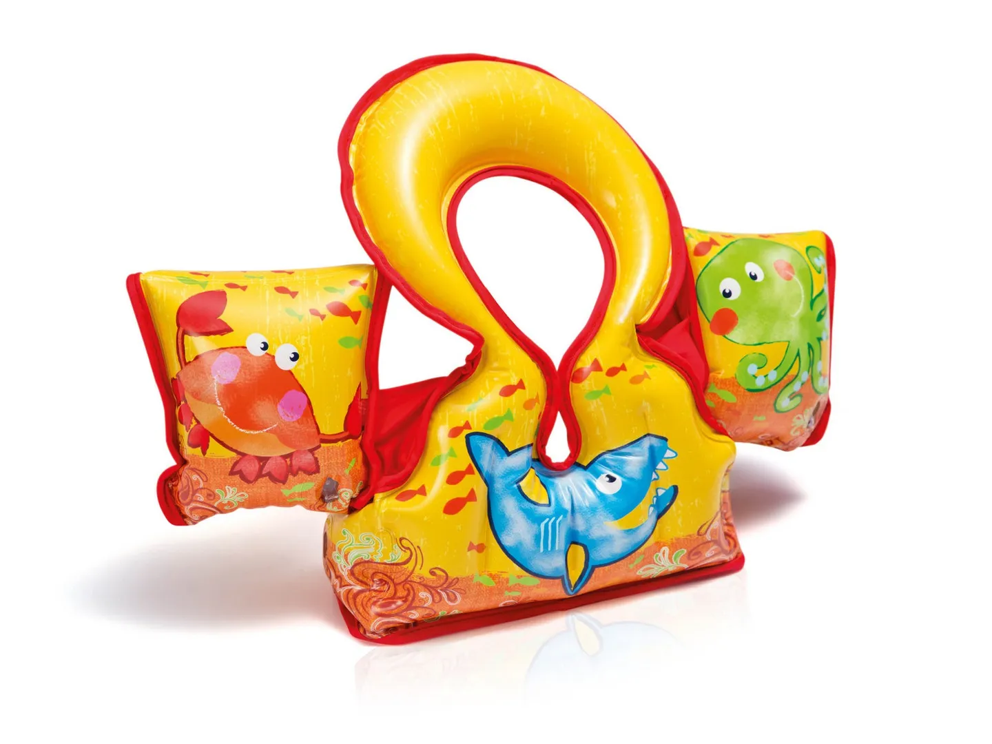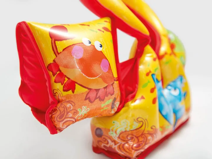 Kamizelka wykonana jest w intensywnym, czerwono-żółtym kolorze z motywem rybek i wodnych zwierząt, by Twój maluch był widoczny w wodzie nawet z dalekiej odległości. Zestaw do wody marki INTEX to niezbędne akcesorium Twojego dziecka podczas nauki pływania.