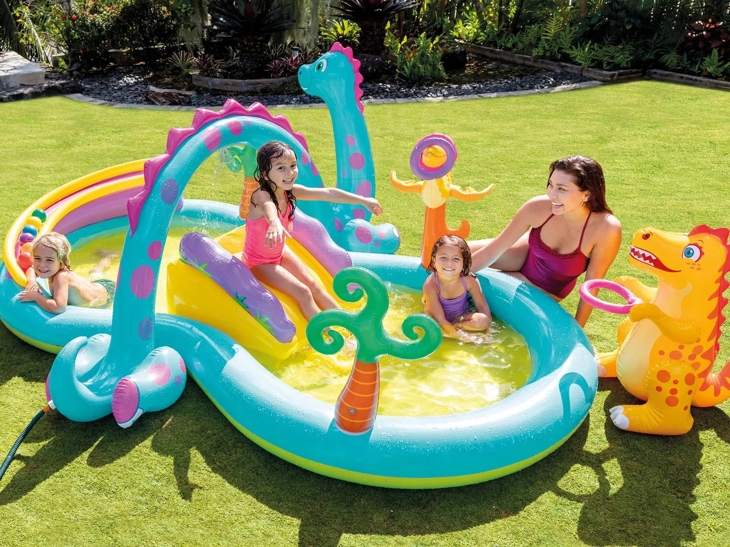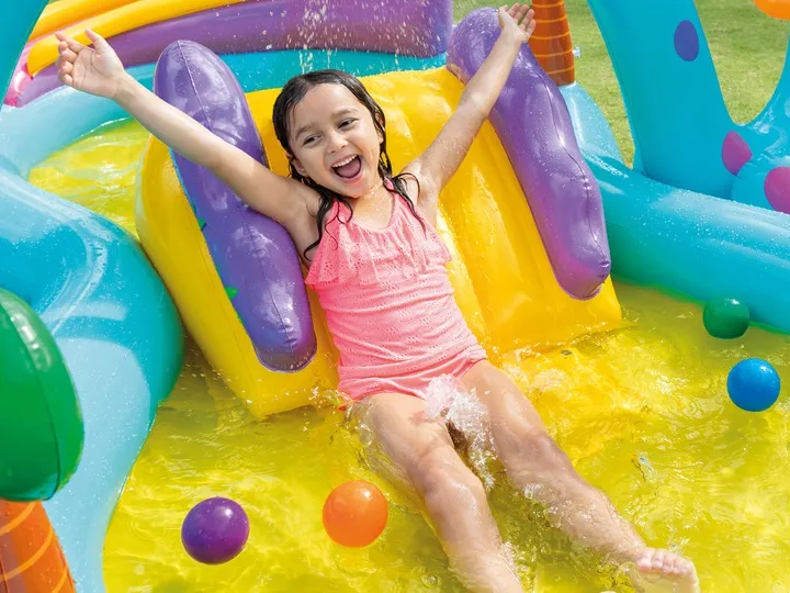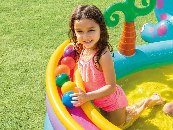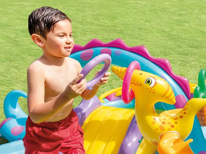 Dmuchany plac zabaw z Dinozaurami sprawdzi się nie tylko jako ogródkowy aqua park, ale też w chłodniejsze dni jako suchy basen.