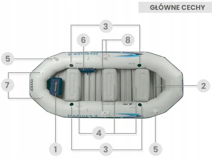 W skład wchodzą także wiosła, wygodna pompka oraz zawory bostońskie, dzięki którym wpompujesz i wypompujesz powietrze.