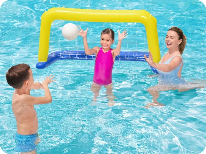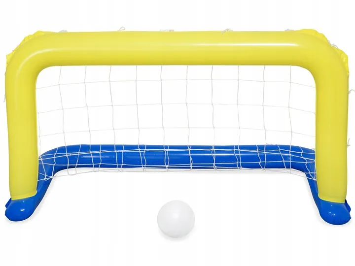 Bestway stworzył zestaw do zabawy, w której brać udział mogą nawet trzyletnie dzieci. Składa się on z dmuchanej bramki z nylonową siatką o wymiarach 142 cm x 76 cm i dmuchanej piłki.