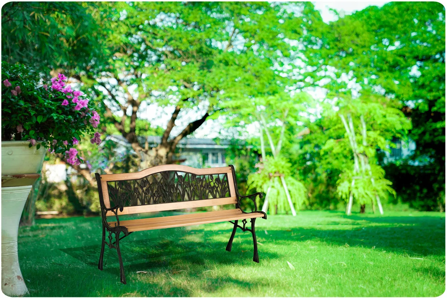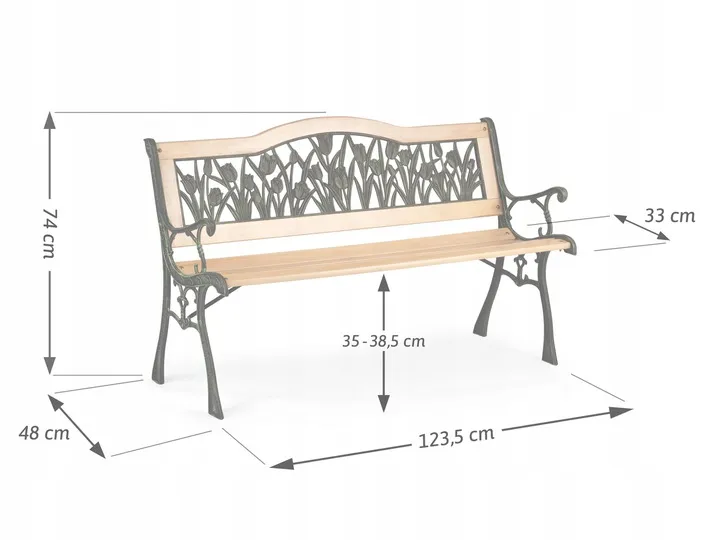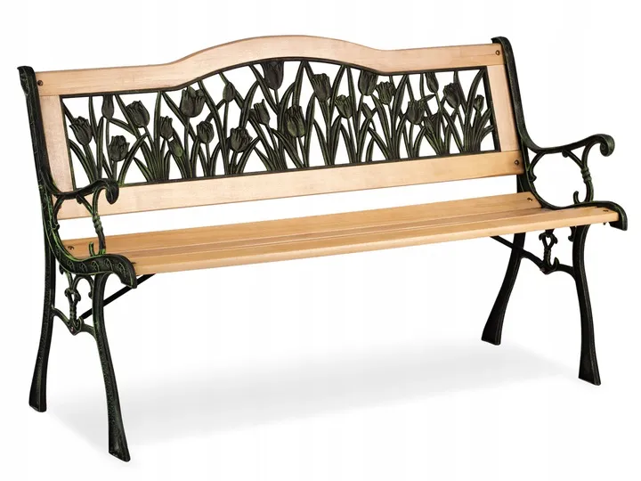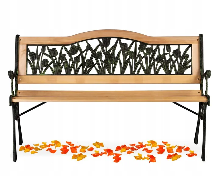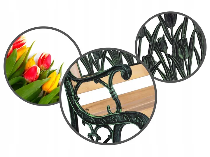 Stylowa ławeczka, która świetnie sprawdzi się w twoim ogrodzie, tarasie lub na patio. Elegancki design przyciąga oko, a roślinne dekory ? wiosenne tulipany ? dodają jej niepowtarzalnego charakteru. Wygodne siedzisko zapewnia komfort wypoczynku na świeżym powietrzu.