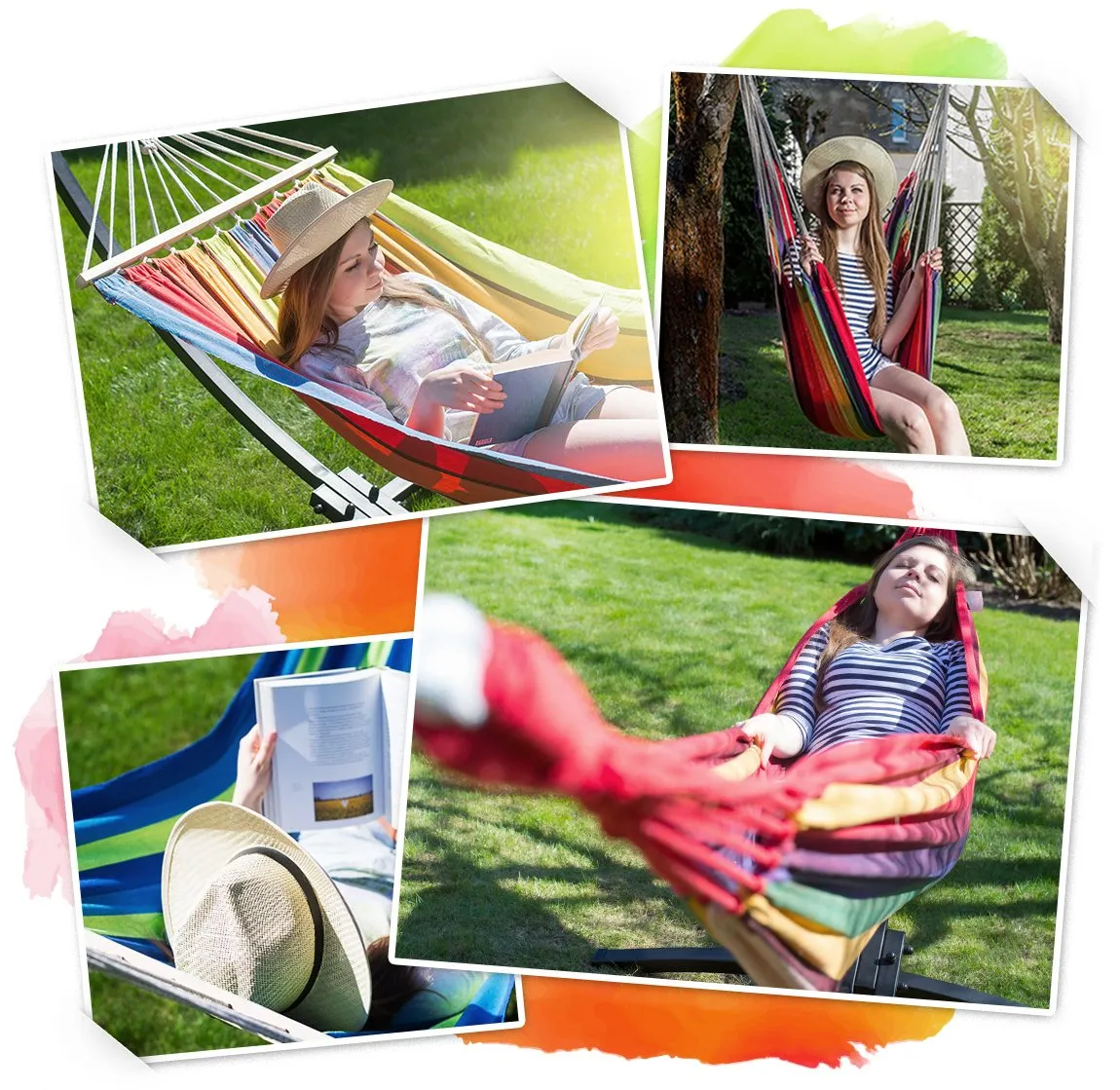 Marzysz o letnim wypoczynku w ogrodzie lub na tarasie? Nie ma nic lepszego niż krzesło brazylijskie! Wystarczy podwiesić jego kraniec do drzewa lub skorzystać z opcjonalnego stelaża aby cieszyć się wypoczynkiem na świeżym powietrzu. Nie masz ogrodu? Nasze krzesło możesz z powodzeniem wykorzystać na tarasie, balkonie a nawet w mieszkaniu! Jest lekkie, więc zabierzesz je ze sobą na piknik, wycieczkę.