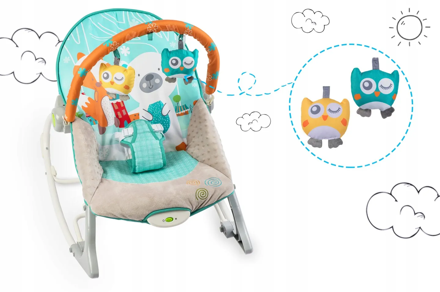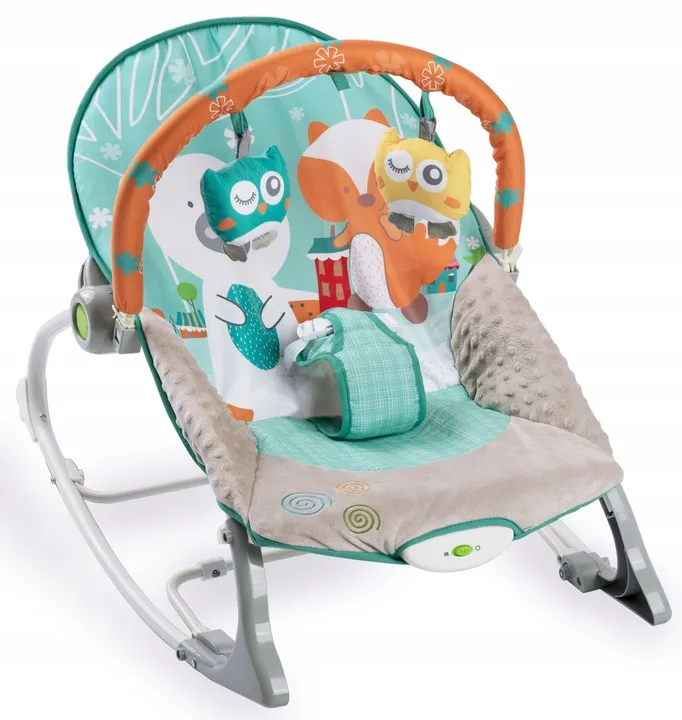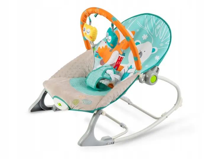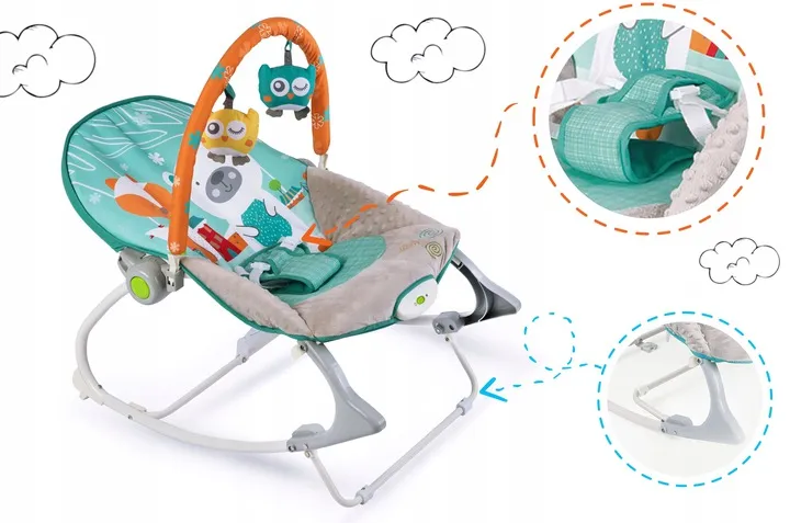 Leżaczek został wyposażony w zdejmowany pałąk z przyczepionymi szeleszczącymi zabawkami - sówką i wilczkiem oraz grzechotką. Zapewnią one Twojemu dziecku rozrywkę, podczas gdy Ty będziesz mógł odpocząć. Te wyjątkowe zabawki stymulują wzrok oraz rozwijają zmysł dotyku.