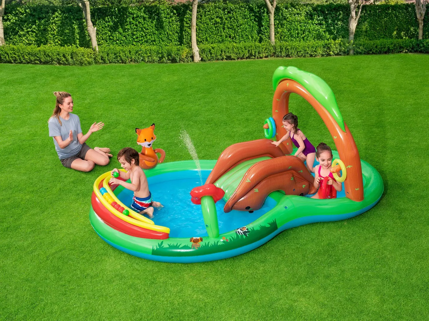 Dmuchana zjeżdżalnia, 2 baseny, wodna fontanna i inne akcesoria zapewnią dziecku zabawę na kilka długich godzin.