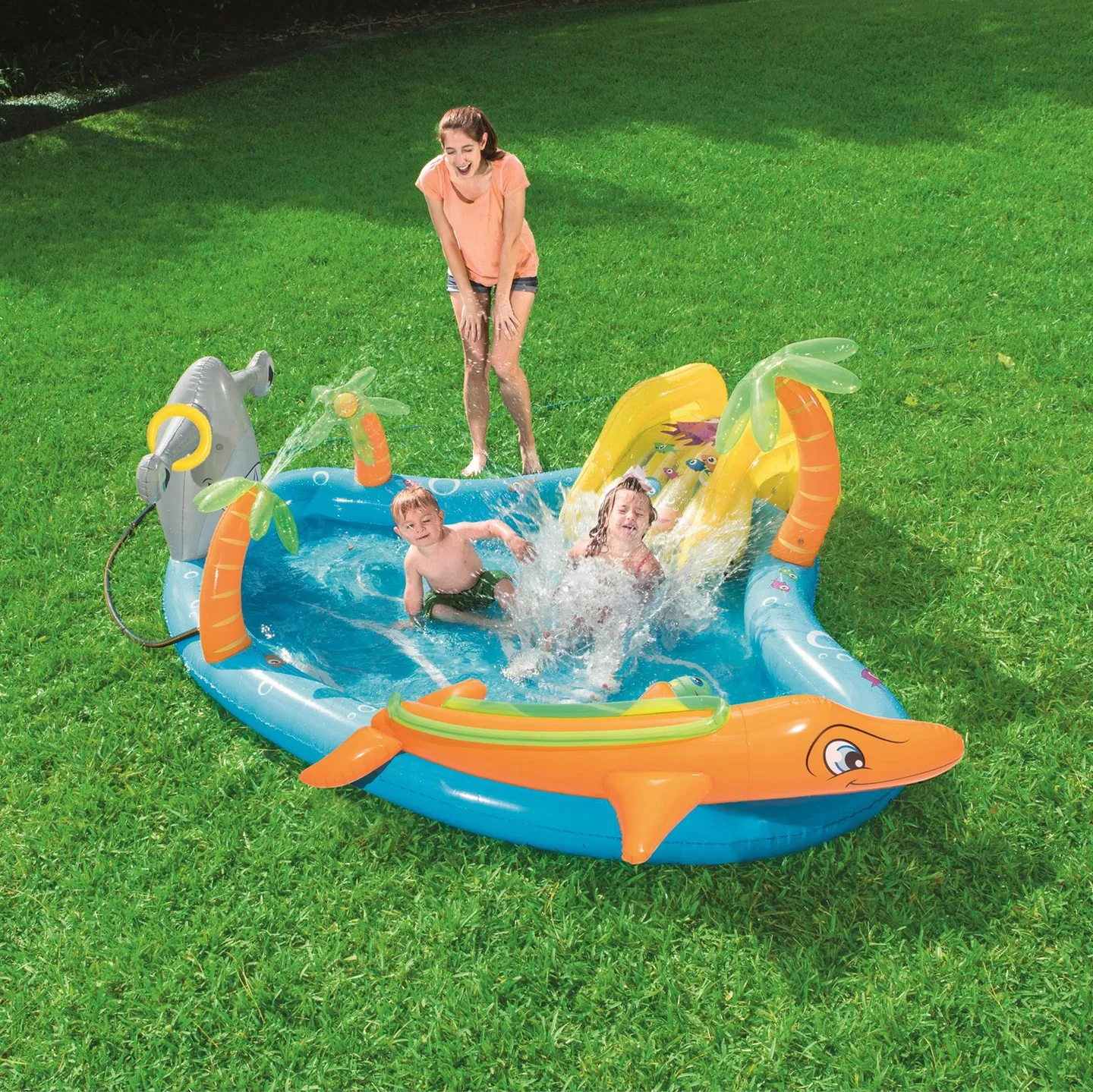 Dmuchana zjeżdżalnia, basen, wodna fontanna i inne akcesoria zapewnią dziecku zabawę na kilka długich godzin.