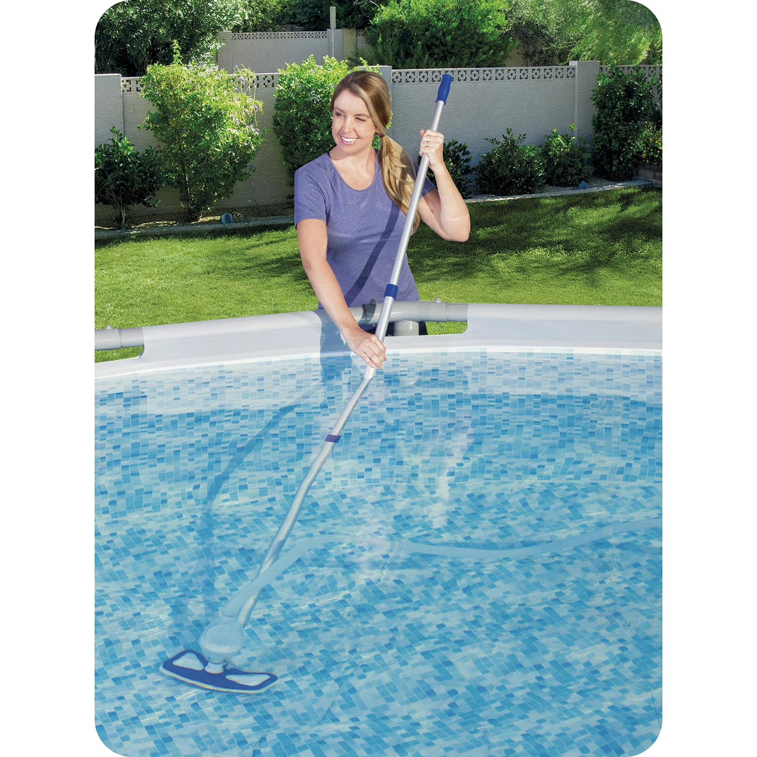 W skład tego zestawu wchodzi aluminiowy kij teleskopowy o długości maksymalnej 279 cm, dzięki czemu bez problemu wyczyścisz nawet większe baseny.