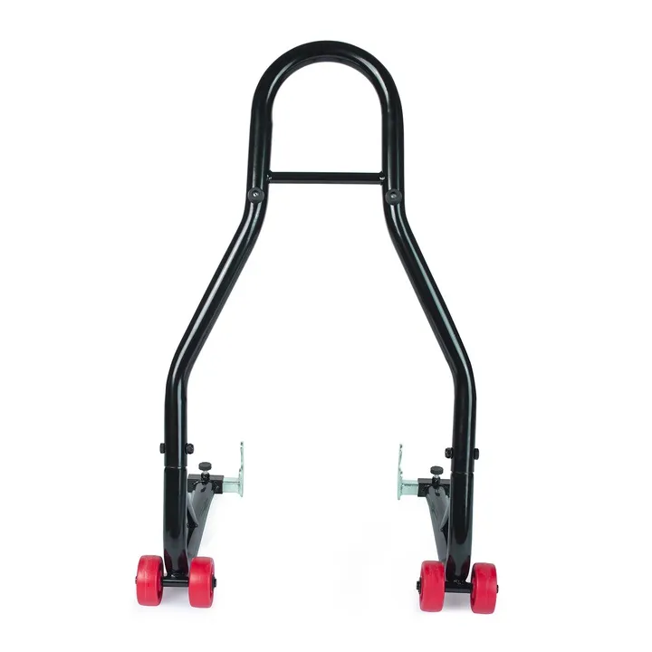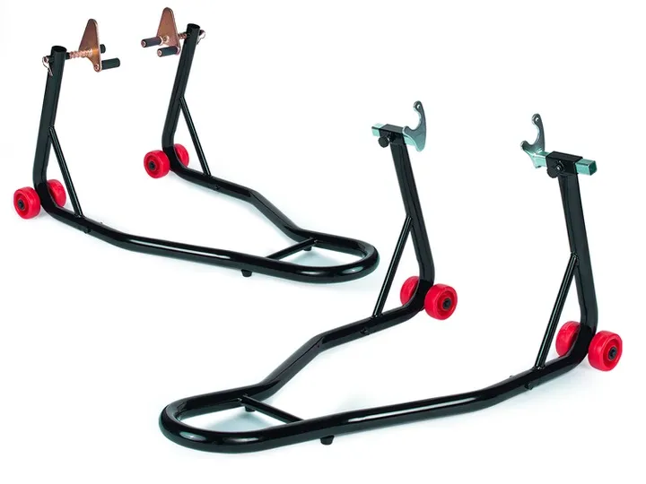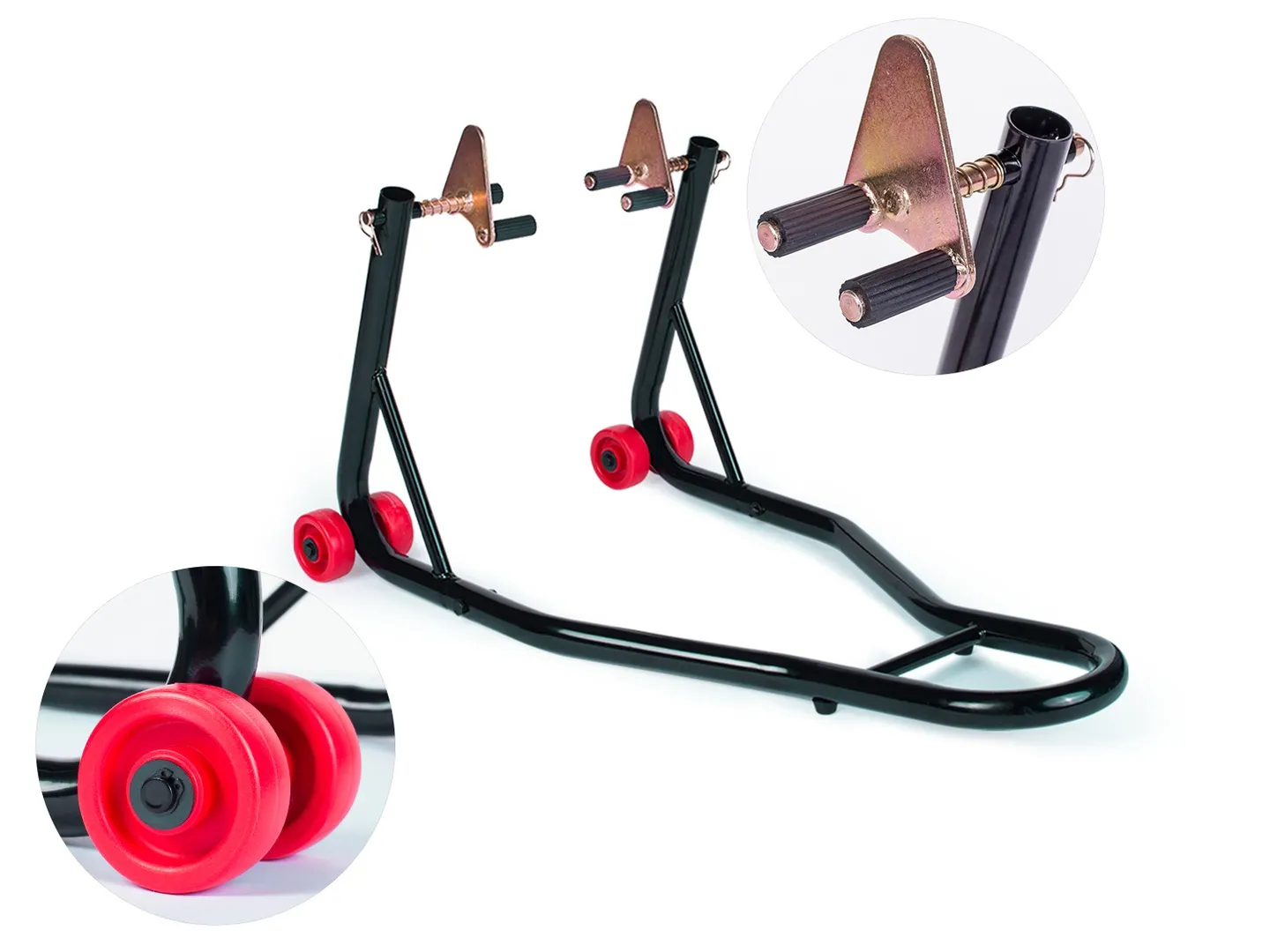 Stojak posiada regulowane adaptery. Wysokość tego modelu to 46 cm, a długość 80 cm. Doskonale sprawdzi się w niewielkich pomieszczeniach, w których liczy się każdy kawałek przestrzeni. Wyposażony jest w podwójne, dodatkowo wzmocnione koła. To doskonały sposób na przechowanie motocyklu lub prace serwisowe! Zestaw obejmuje dwie sztuki.