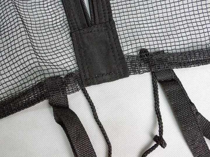 Szybka w montażu - montowana do trampoliny poprzez nałożenie tuneli na słupki, u dołu zabezpieczana sznurkiem do ramy trampoliny (sznurek w komplecie). Siatka posiada pionowe wejście zamykane na zamek błyskawiczny.