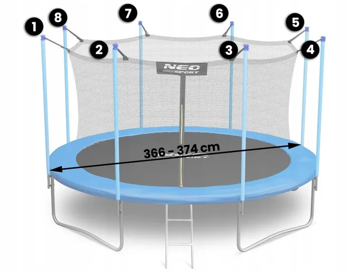 WAŻNA INFORMACJA: Średnicę trampoliny mierzymy "od słupka do słupka", rozmiar trampoliny obejmuje całość podstawy, czyli powierzchnię do skakania + kołnierz.