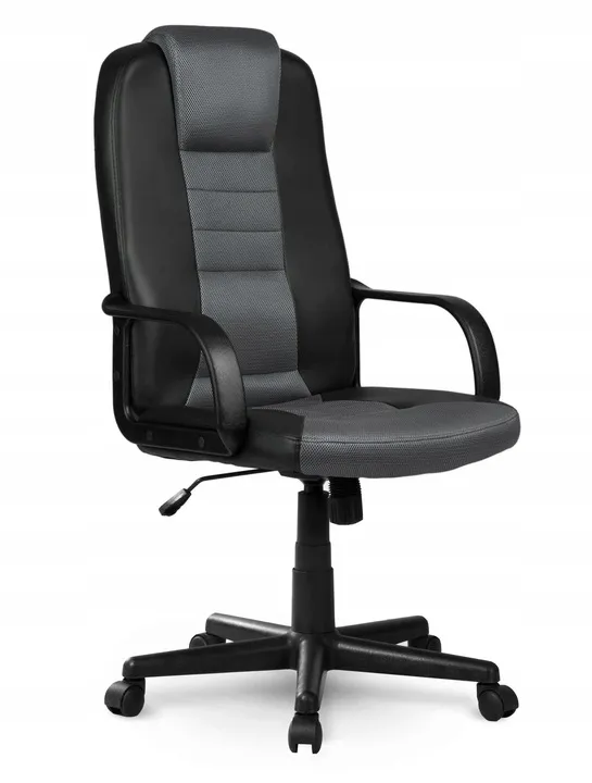 Fotel obszyty oddychającym materiałem- mikrosiatką, obszyty dodatkowo elementami wykonanymi ze skóry ekologicznej.