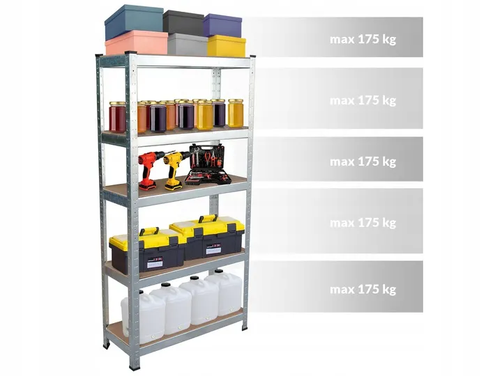 Regał składa się z 5 półek, a jego maksymalne obciążenie to aż 875 kg!