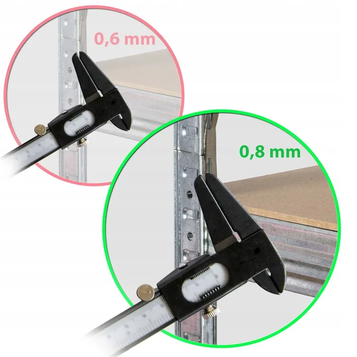 Grubość profilu: 0,8mm - wzmacniany (większość konkurencyjnych regałów od 0,5 do 0,6 mm)