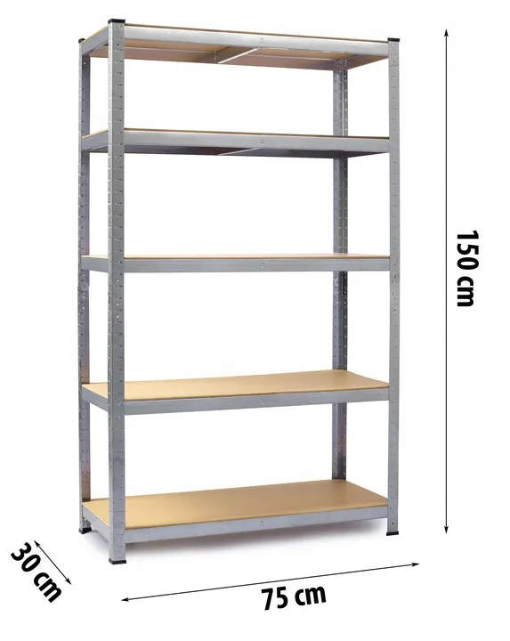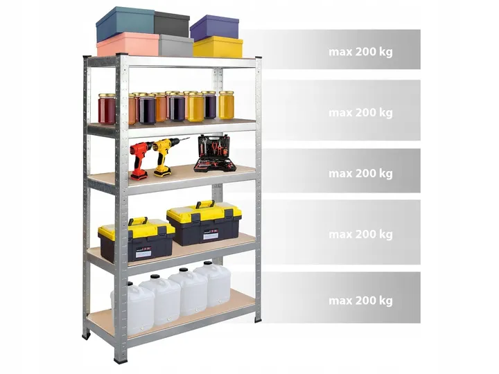 Regał składa się z 5 półek, na których możesz ułożyć produkty, kartony, czy też urządzenia maksymalnie obciążając każdą półkę aż do 200 kg.