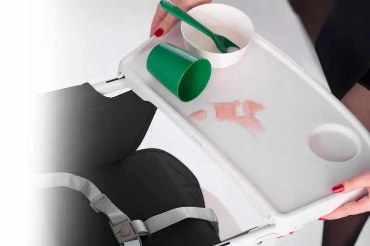 Wyższe brzegi tacki zapobiegną zsuwaniu się posiłków czy napojów.