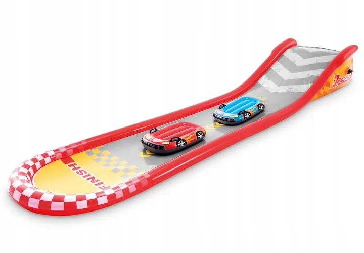 Dmuchana zjeżdżalnia Tor Wyścigowy Intex to zabawa dzięki której Twoje dzieci aktywnie spędzą wakacje na świeżym powietrzu.