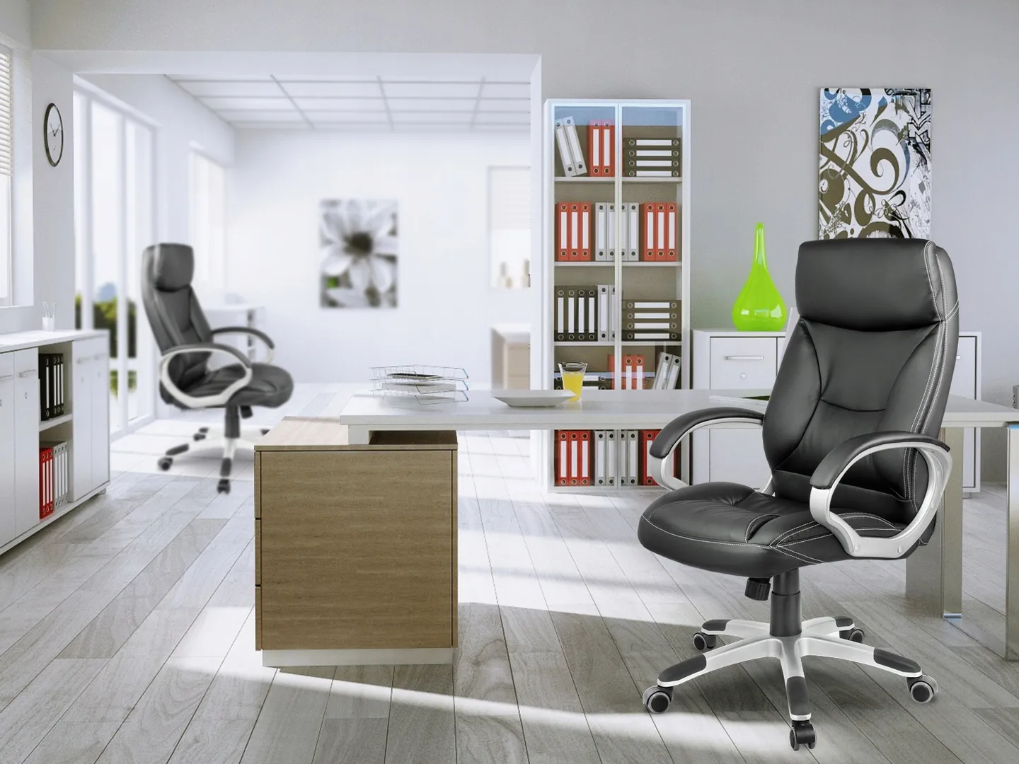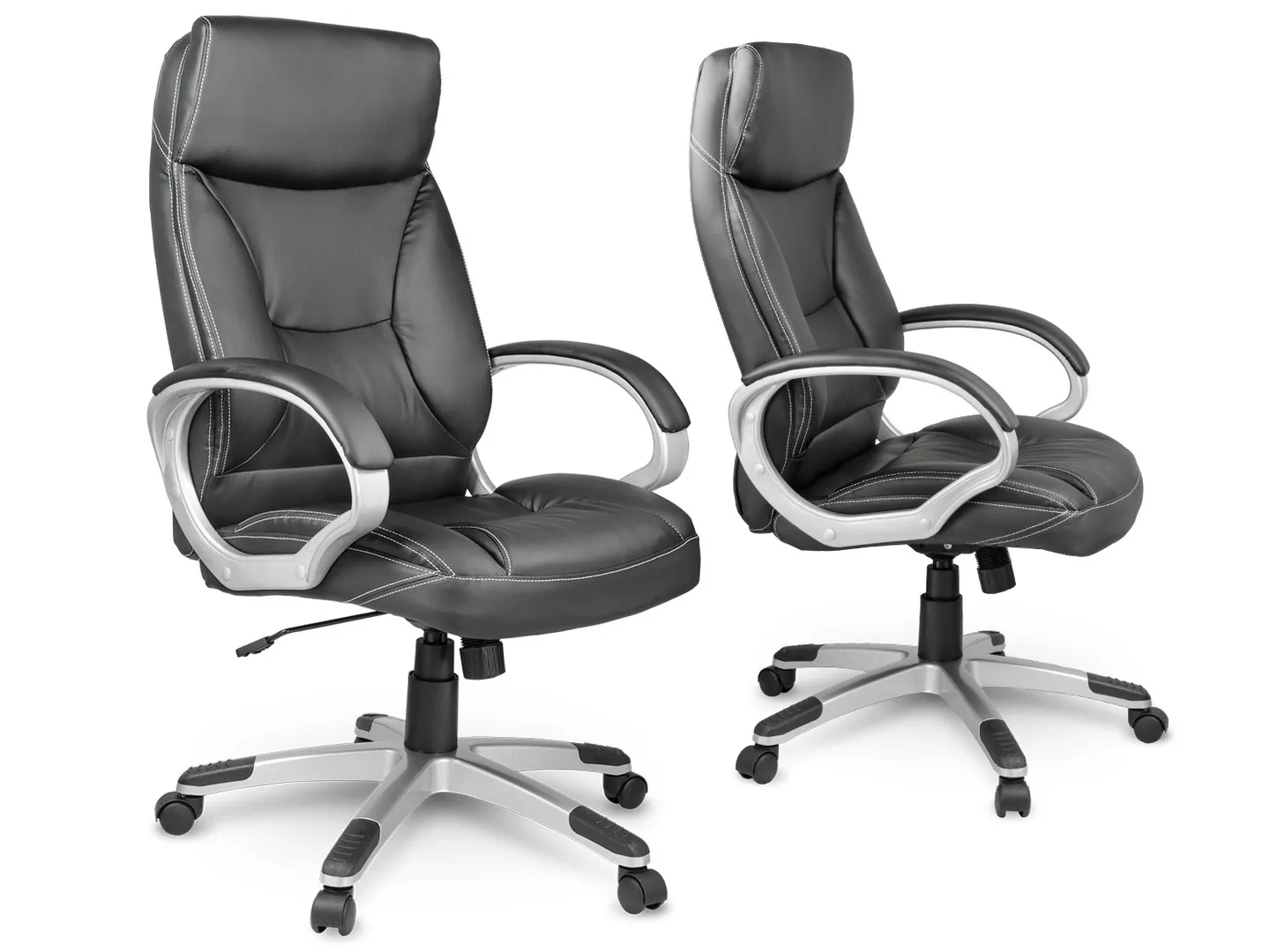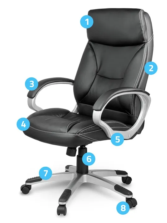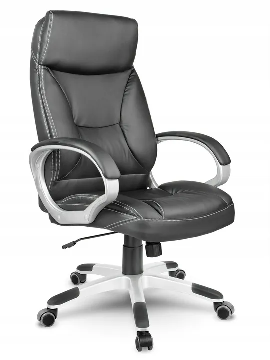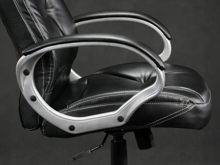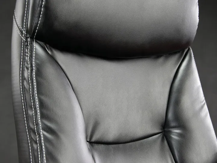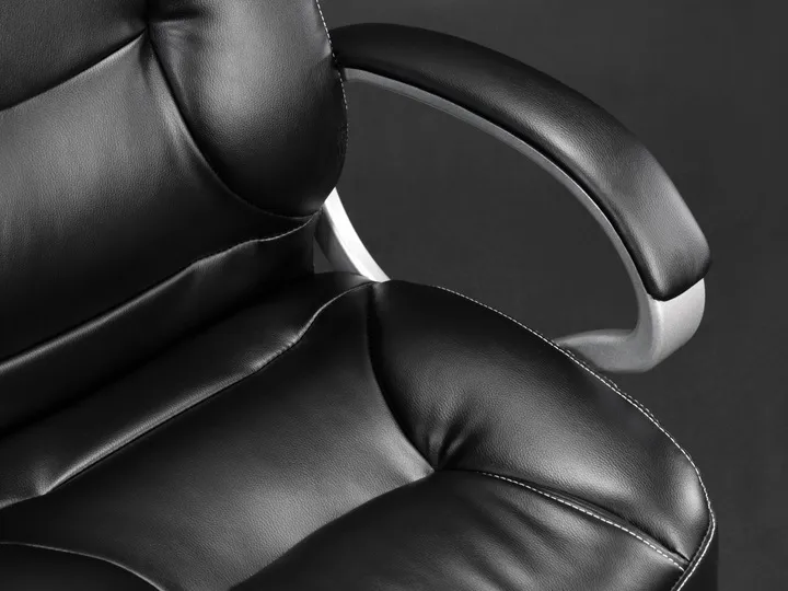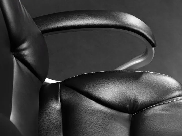 Elegancki i nowoczesny design fotela komponuje się z dowolnie zaaranżowaną przestrzenią biurową. Sylwetkę fotela zaprojektowano tak, aby lekka forma harmonizowała z solidną linią, co dodaje mu profesjonalnego charakteru. Walory estetyczne uzupełnia biały szew, tworzący przyjemny kontrast na tle czarnej tapicerki z ekoskóry.