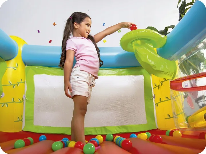 Dmuchana trampolina Bestway z dołączonymi piłeczkami, to niesamowita frajda przeznaczona dla dzieci od lat 3. Własny mini zestaw ogrodowy o wymiarach 175 x 173 x 114 cm, na wzór popularnego, dmuchanego, często występującego na festynach, zamku do skakania, to marzenie każdego dziecka. Po takim zakupie, Twój maluch pokocha zabawy na świeżym powietrzu.