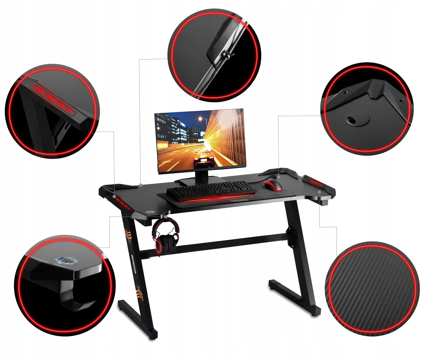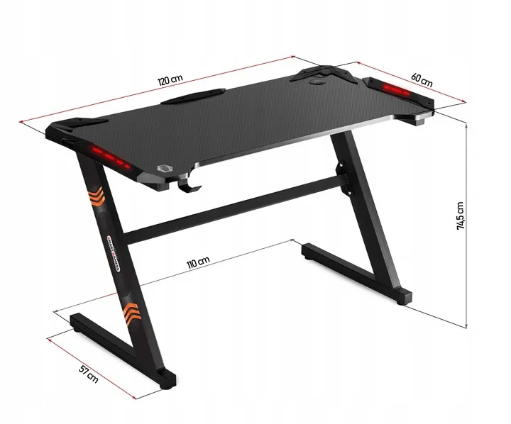 Sięgnij po designerskie biurko, stabilne, odporne na zarysowania i zabrudzenia, wyposażone w podświetlenie LED, uchwyt na słuchawki i system prowadzenia kabli!