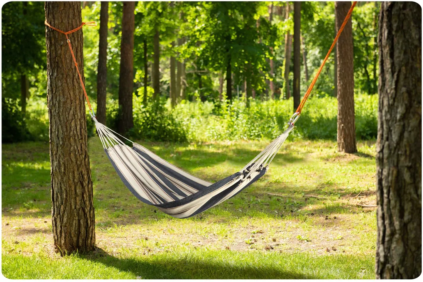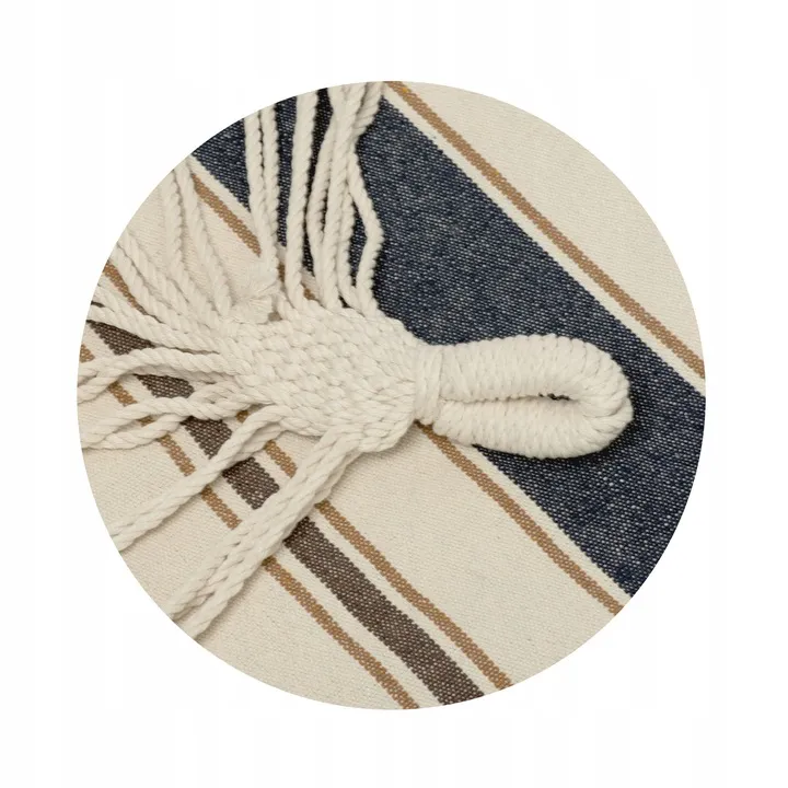 Wystarczy przywiązać krańce hamaka zakończone sznurami do drzew, słupków lub skorzystać z opcjonalnego stelaża aby cieszyć się wypoczynkiem na świeżym powietrzu.