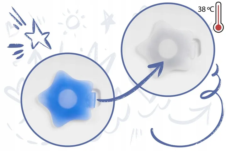 Korek w kształcie gwiazdki zmieni swój kolor z niebieskiego na biały, jeśli temperatura wody przekroczy 38°C.