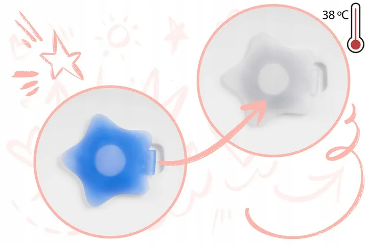 Korek w kształcie gwiazdki zmieni swój kolor z niebieskiego na biały, jeśli temperatura wody przekroczy 38°C.