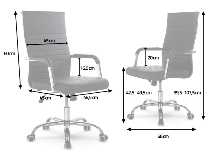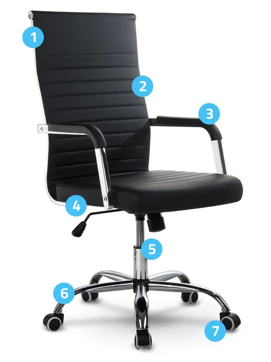 Specjalnie wyprofilowane oparcie stanowi komfortowe podparcie dla okolicy lędźwiowej kręgosłupa, zapewniając maksymalną wygodę użytkowania. Chromowana, pięcioramienna podstawa z szeroko rozstawionymi kółkami wpływa na łatwość poruszania się oraz odpowiednio stabilizuje cały fotel.
