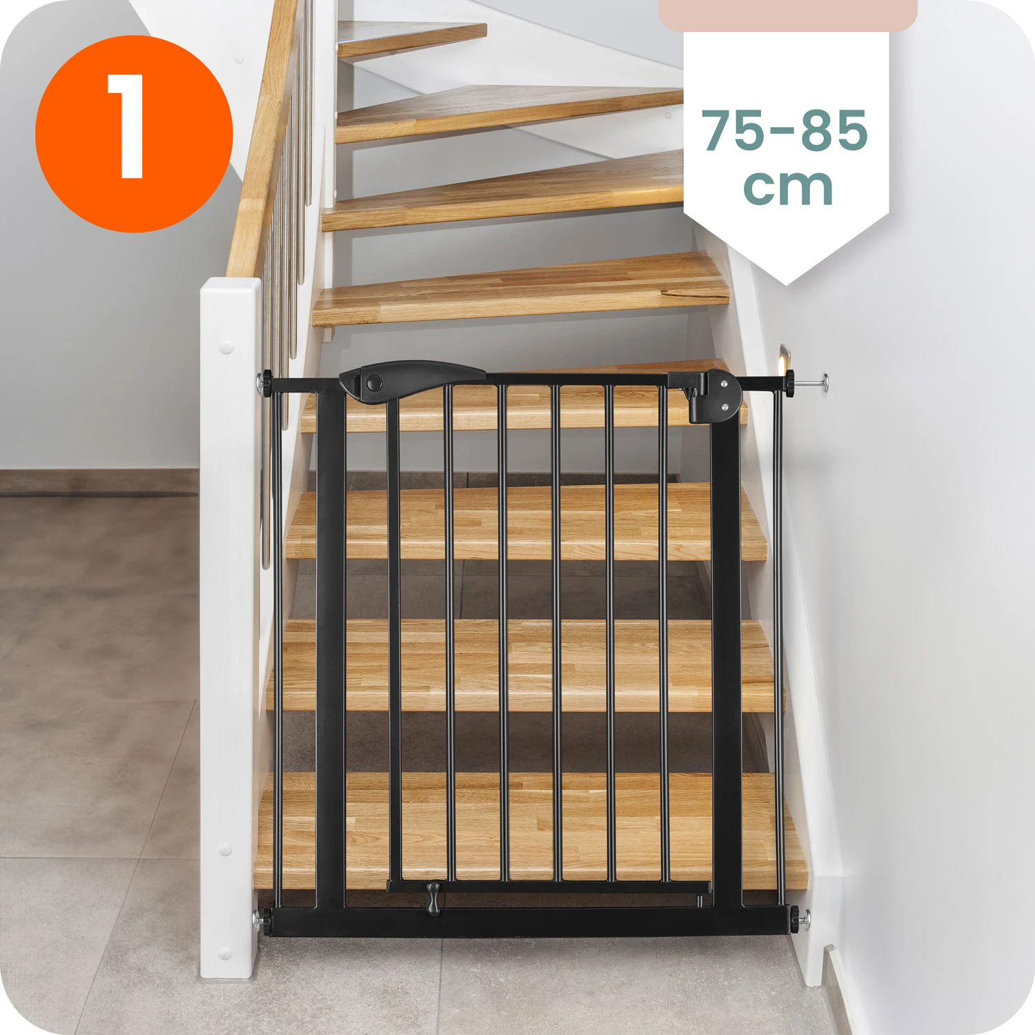Regulowana szerokość pozwala na zamontowanie jej w drzwiach i przejściach od 75 do 115 cm.