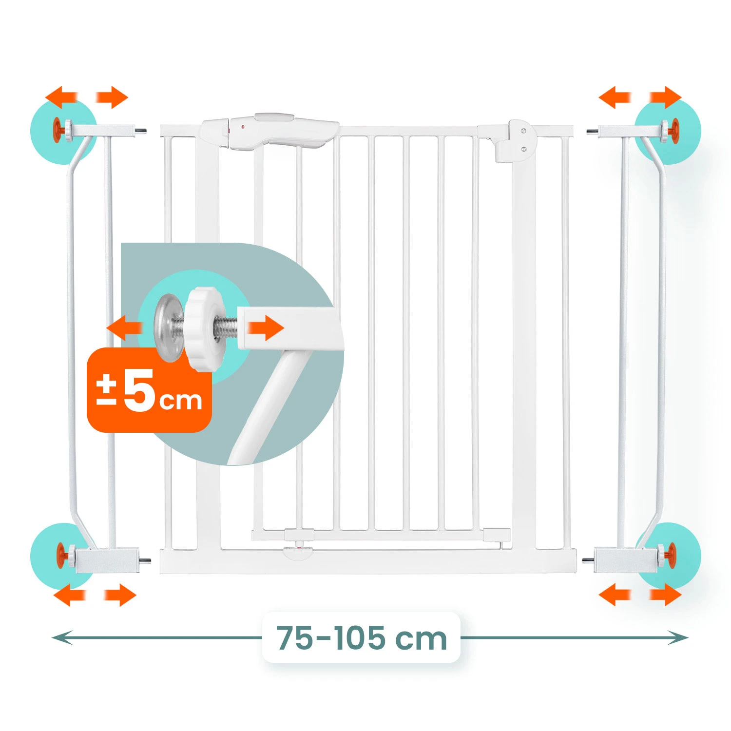Regulowana szerokość pozwala na zamontowanie jej w drzwiach i przejściach od 75 do 105 cm.