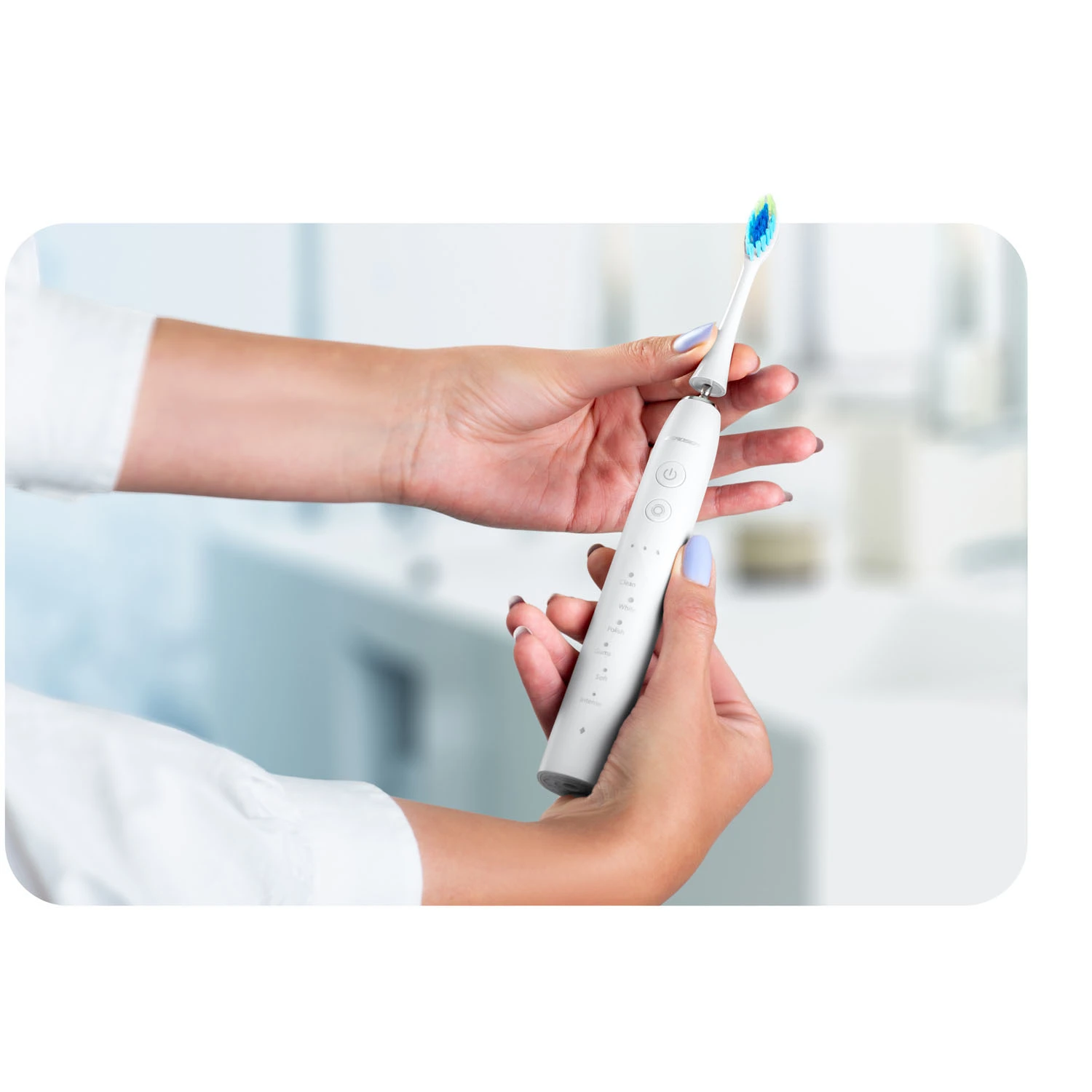 2. WHITE – Tryb wybielania: zaprojektowany, by redukować przebarwienia i poprawiać naturalny kolor zębów.