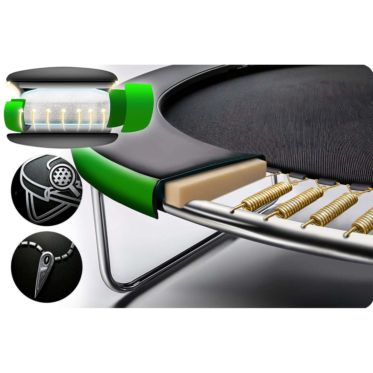 Zastosowaliśmy wydłużone i mocno naprężone sprężyny o zwiększonej elastyczności – dla jeszcze lepszego odbicia i komfortu skakania.