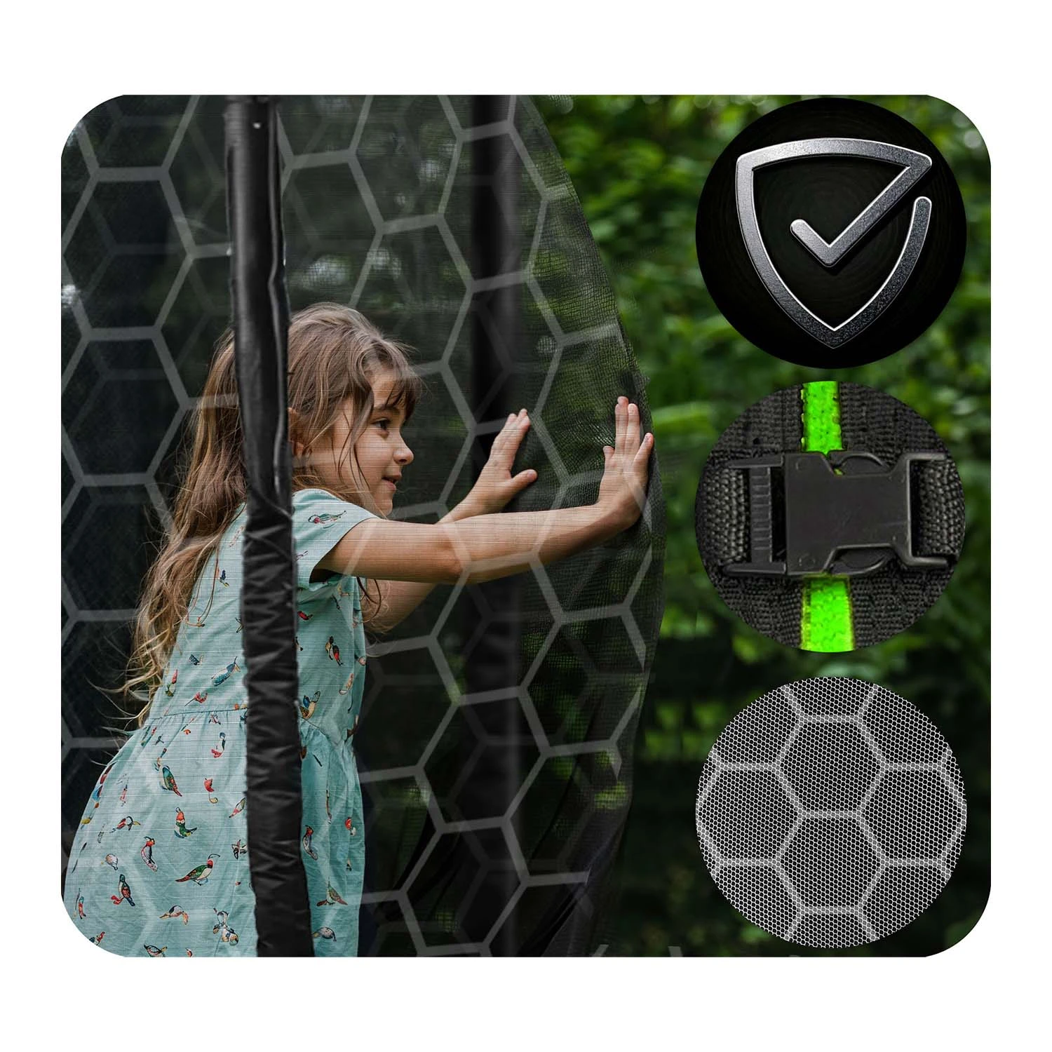 ✅ Bardzo wytrzymała siatka zapewnia bezpieczeństwo podczas zabawy. Specjalna technologia plecenia zapewnia, że wytrzyma nawet najśmielsze wygibasy i zapewni bezpieczeństwo.