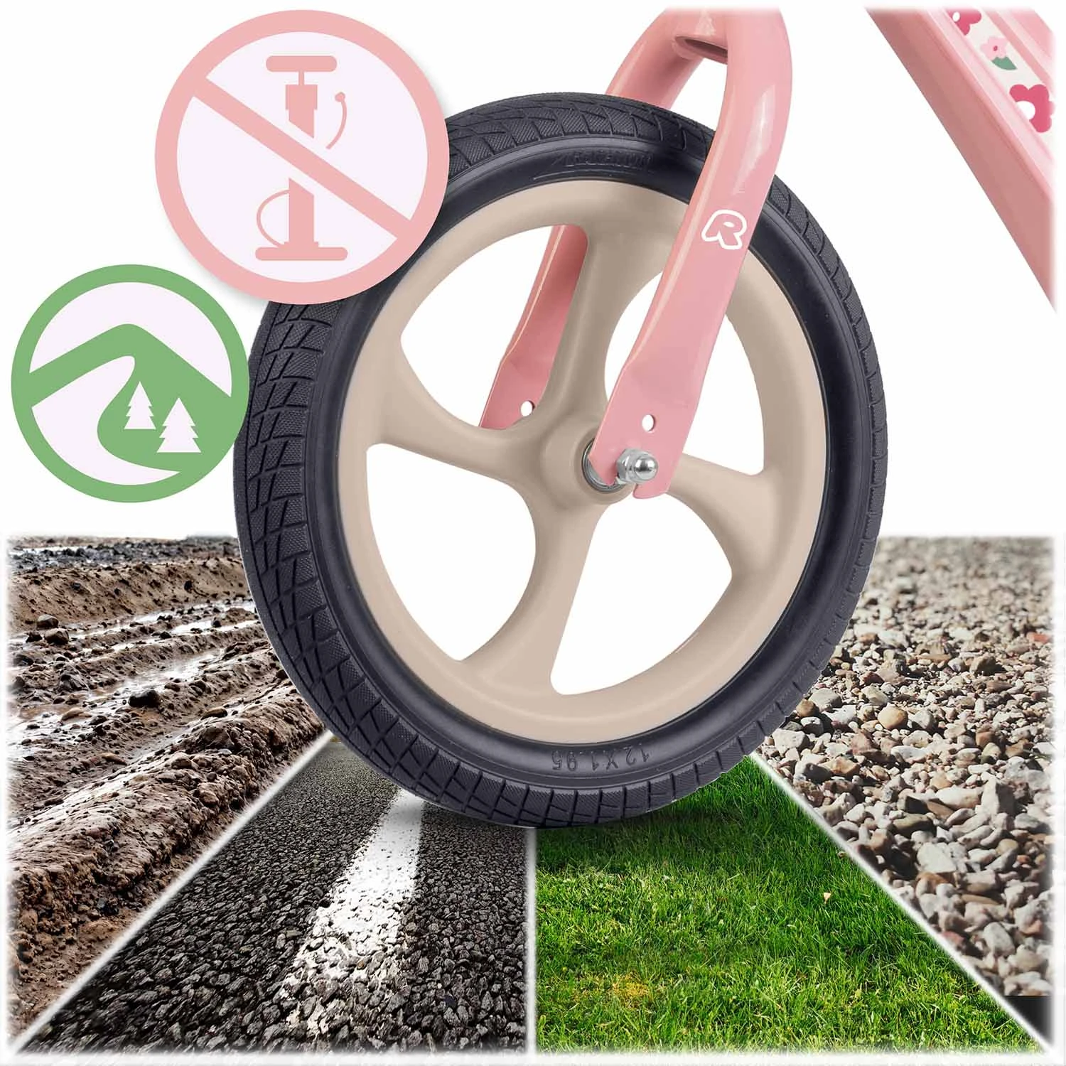 • Koła: duże, solidne koła z pianki EVA z wytrzymałymi oponami, zapewniające stabilność i płynność jazdy. Cicha praca podczas jazdy sprawia, że rowerek nie jest uciążliwy dla ucha nawet podczas jazdy w domu.