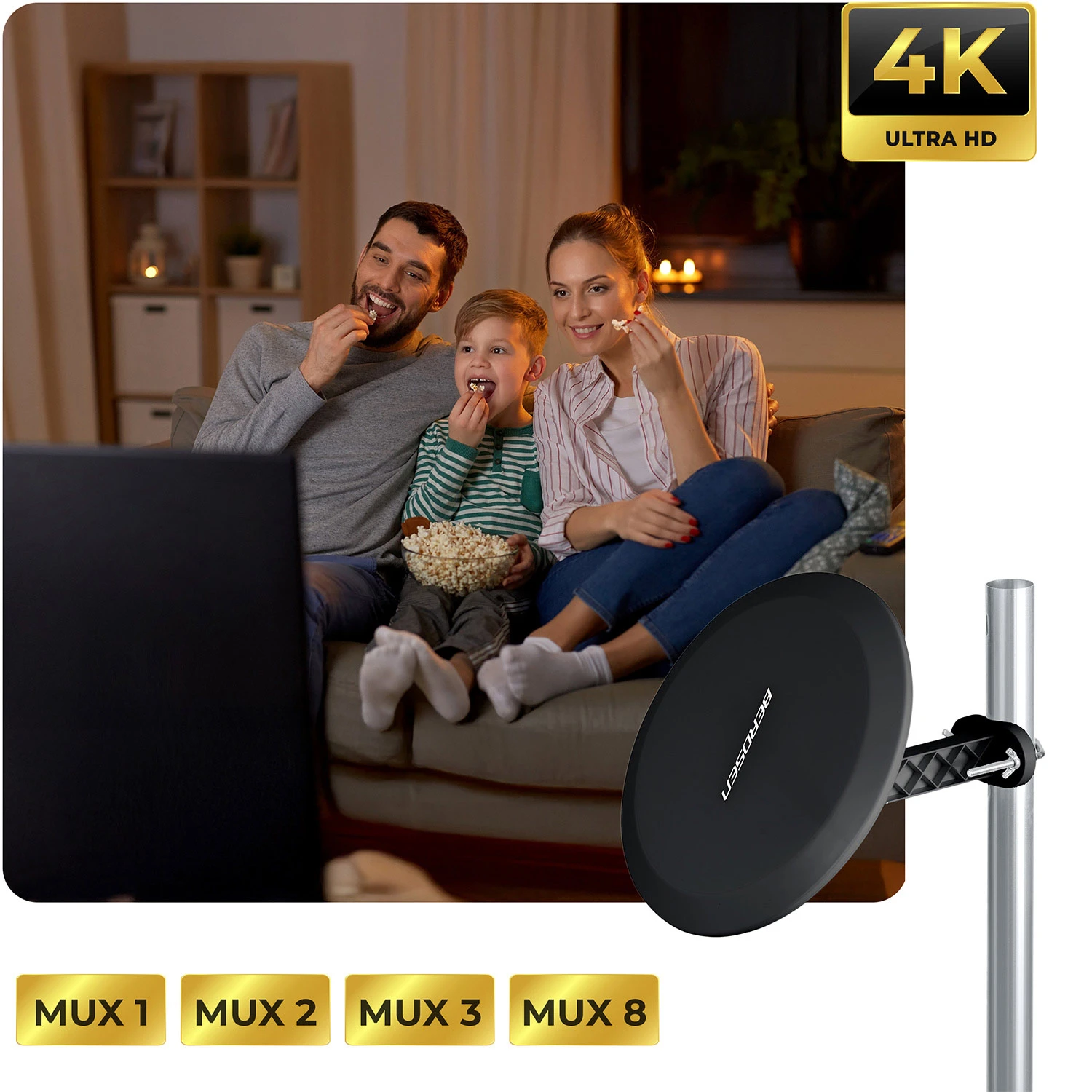 • Antena wewnętrzno-zewnętrzna aktywna do odbioru telewizji naziemnej w jakości 4K.