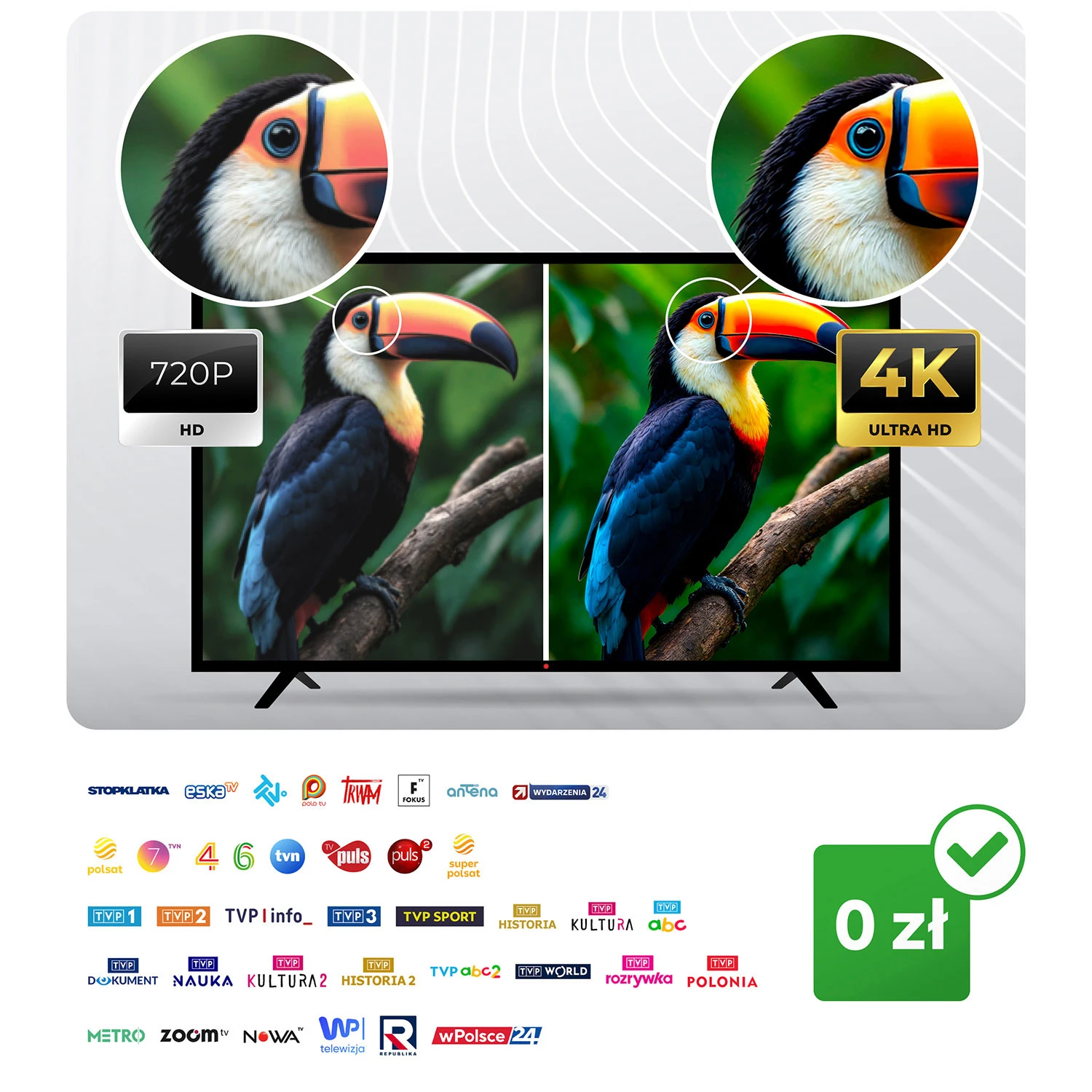 Zamień rozmazany obraz na perfekcyjną ostrość 4K i ciesz się telewizją tak wyraźną, jakbyś patrzył przez okno. Oglądaj swoje ulubione kanały bez abonamentu – ponad 30 stacji w najwyższej dostępnej jakości obrazu.