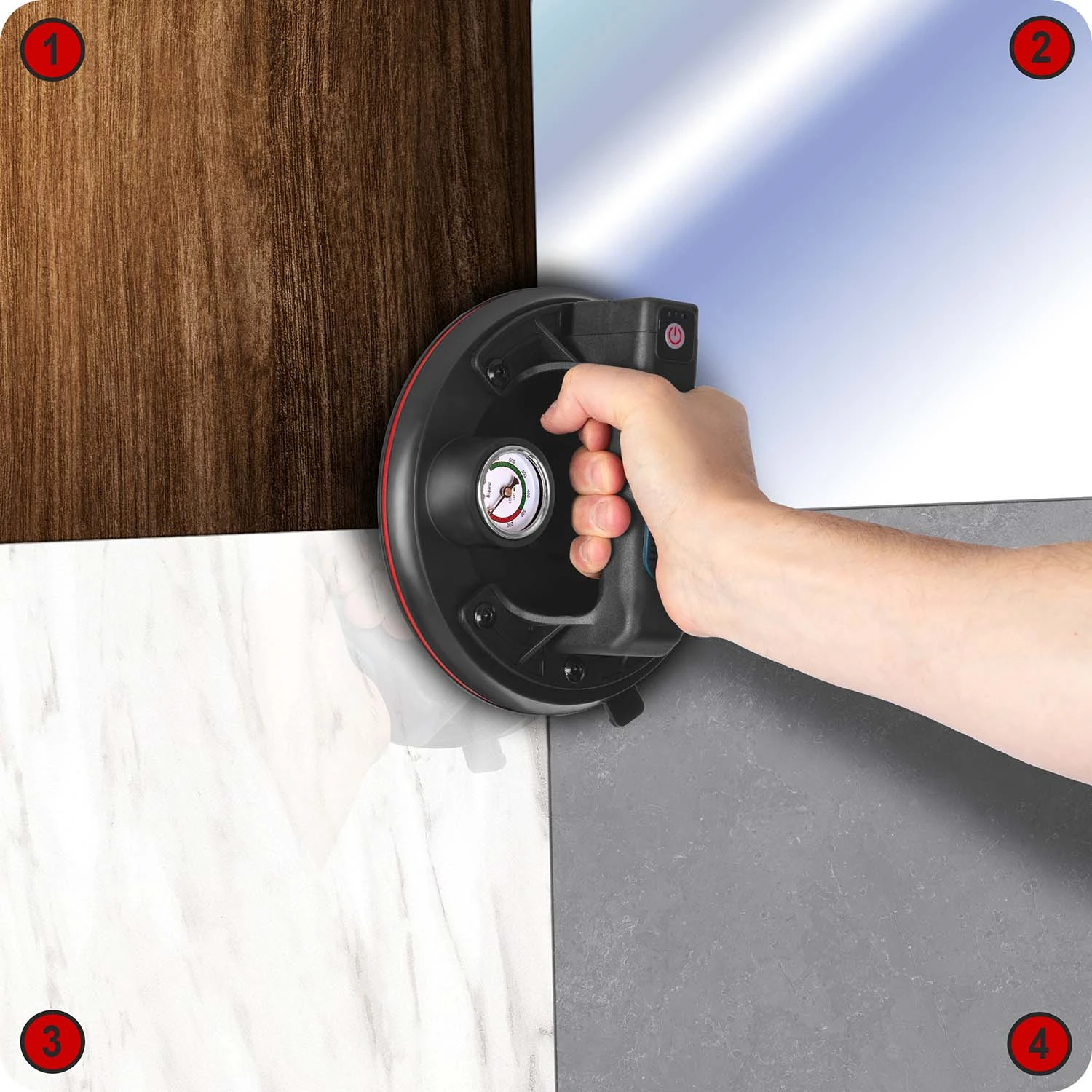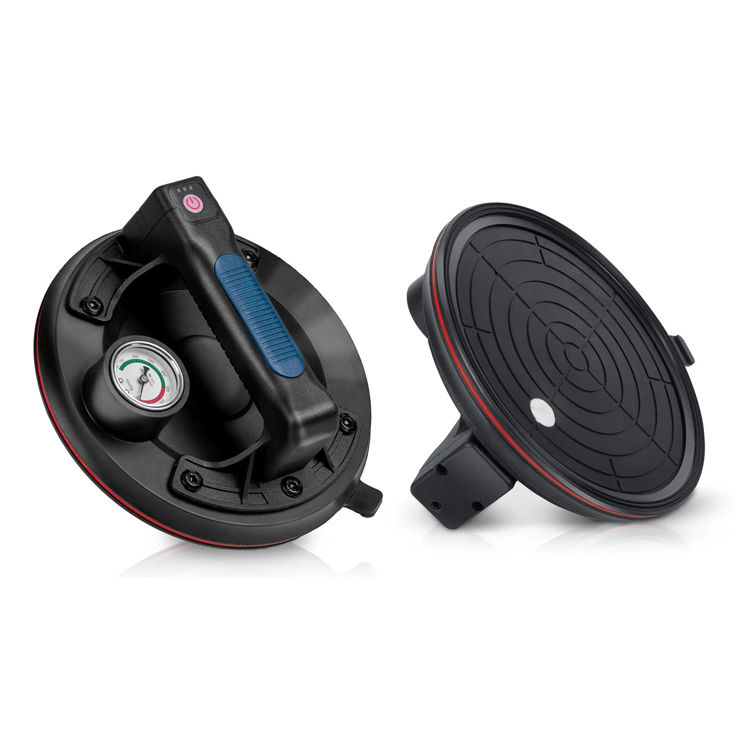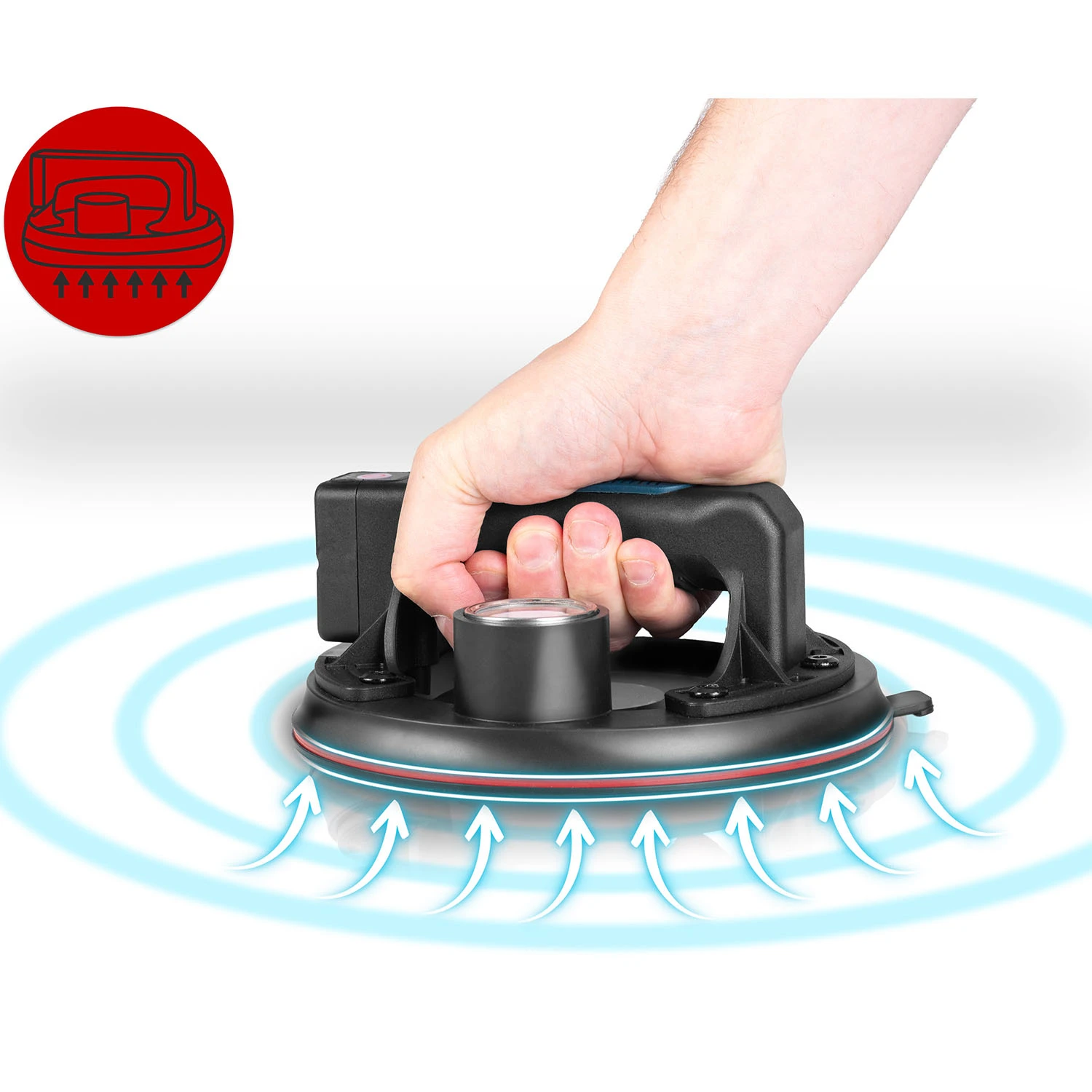 Po przyłożeniu do gładkiej powierzchni urządzenie wysysa powietrze spod gumowego dysku. Powstaje silne podciśnienie, które stabilnie „przykleja” ją do materiału.