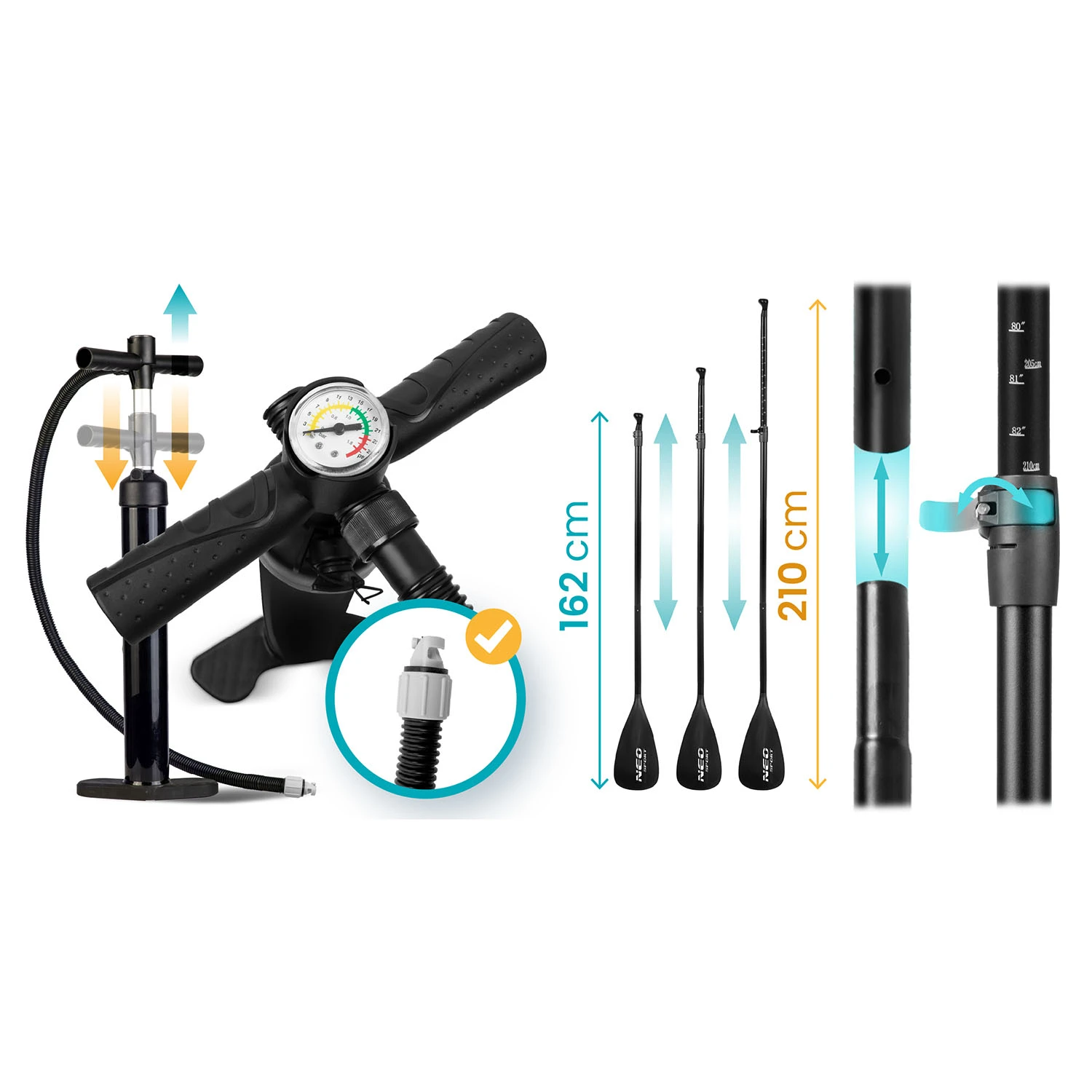 ✅ Kompletny zestaw — w zestawie wiosło, pompka, smycz surferska (leash) i plecak.