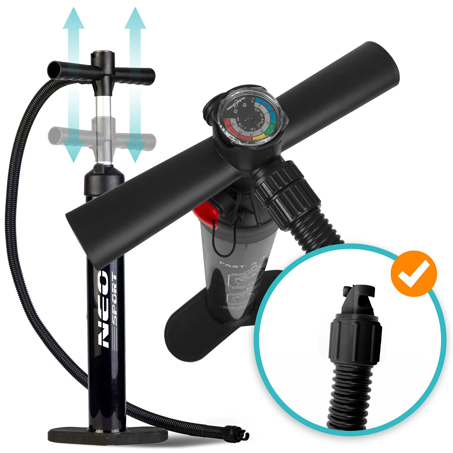 ✅ Dwukierunkowe pompowanie – tłoczy powietrze zarówno przy nacisku, jak i unoszeniu tłoka – szybciej napompujesz deskę.