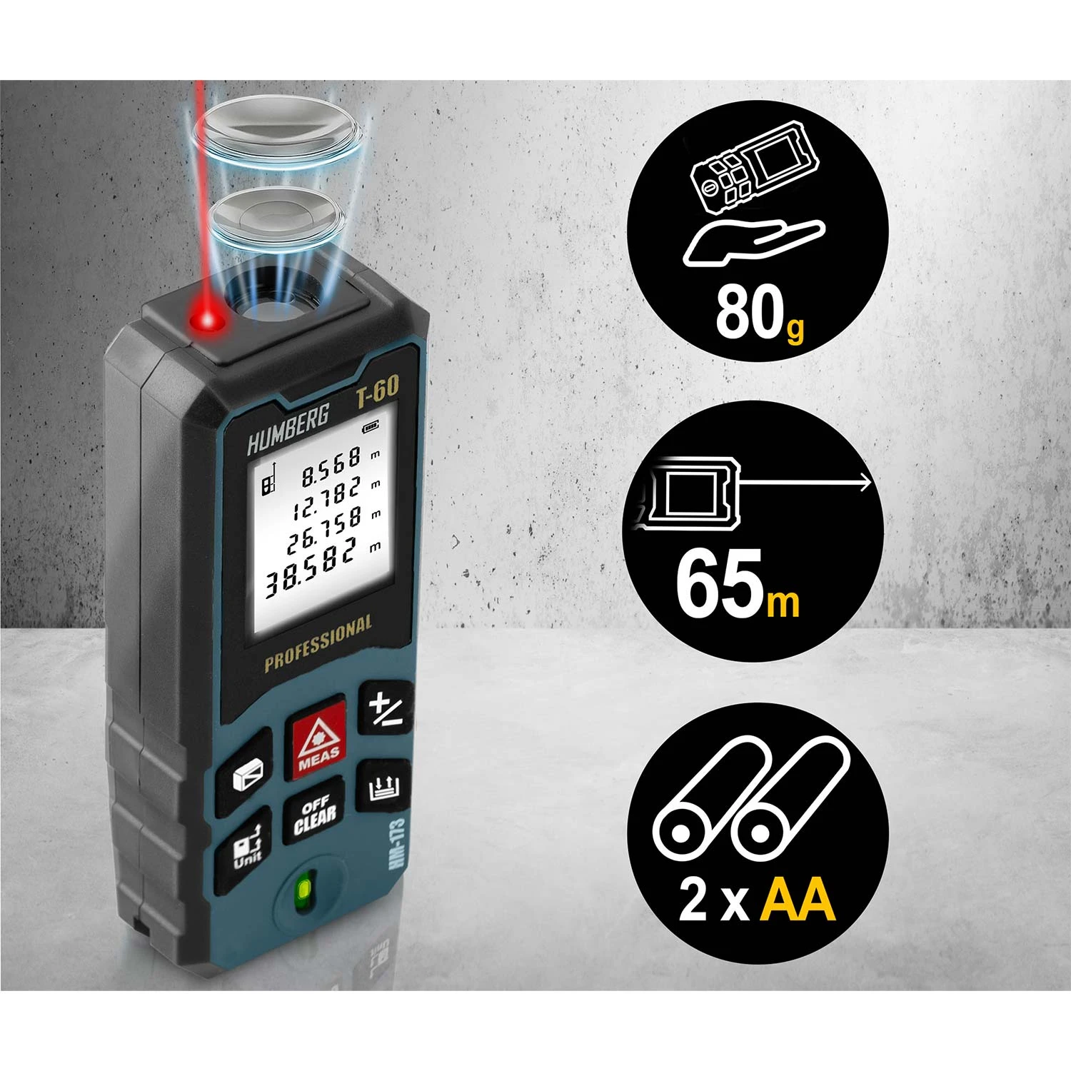 Dalmierz laserowy HUMBERG T-60 umożliwia pomiar aż do 65 metrów, co odpowiada szerokości całego boiska piłkarskiego! Dzięki temu masz możliwość dokładnych pomiarów na dużych odległościach, zarówno w pracy, jak i w terenie.