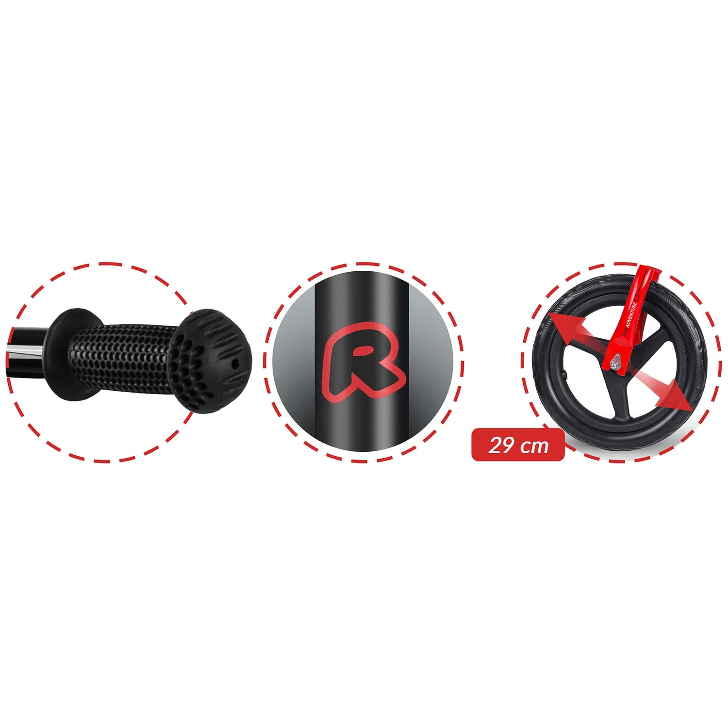 • Kierownica: wyposażona w antypoślizgowe rączki ze stoperami, zapewniające pewny chwyt i kontrolę podczas jazdy.