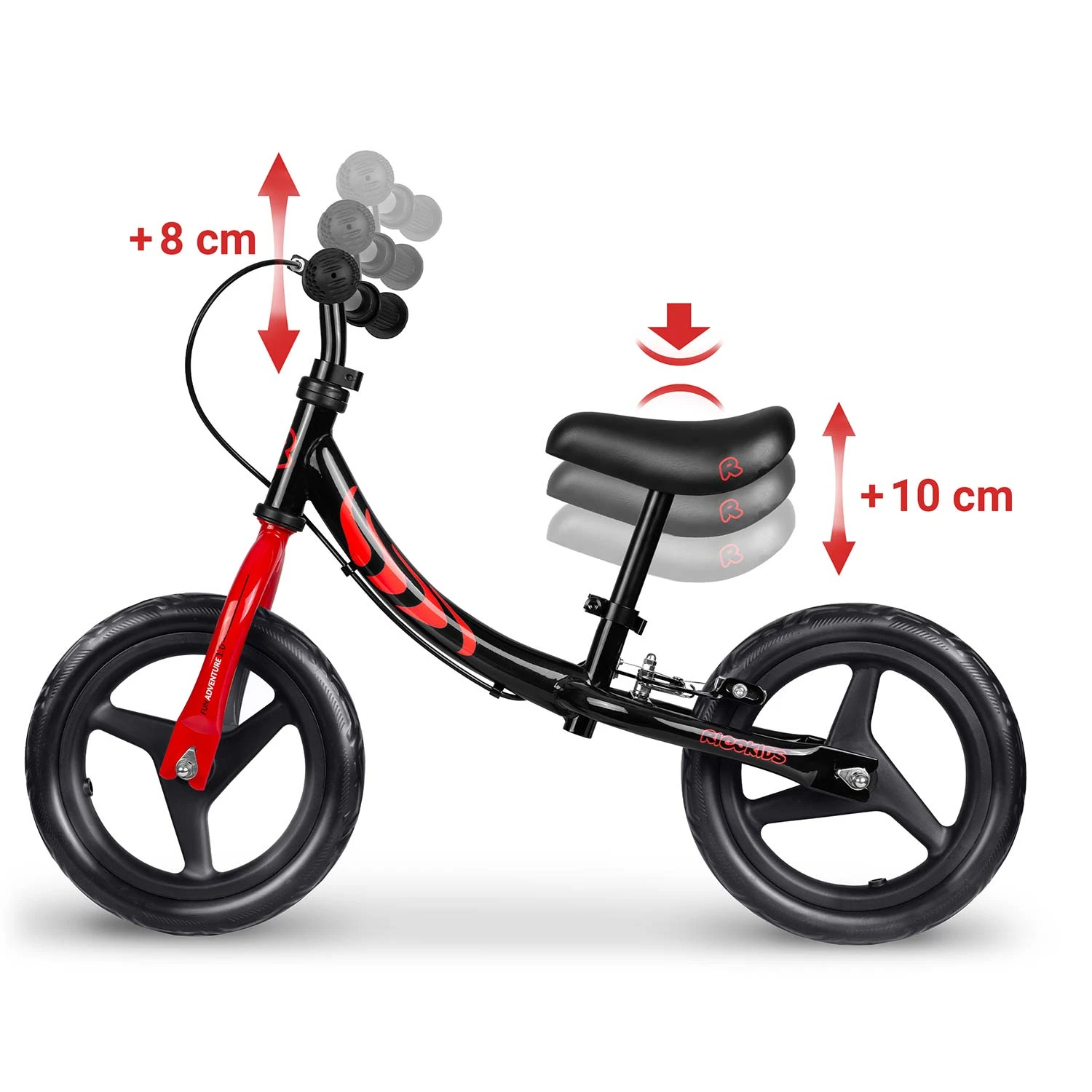 • Dłuższy okres użytkowania: możliwość regulacji wysokości siedziska aż o 10 cm pozwala dostosować rowerek do zmieniającego się wzrostu dziecka, dzięki czemu rowerek może być użytkowany przez dłuższy czas.