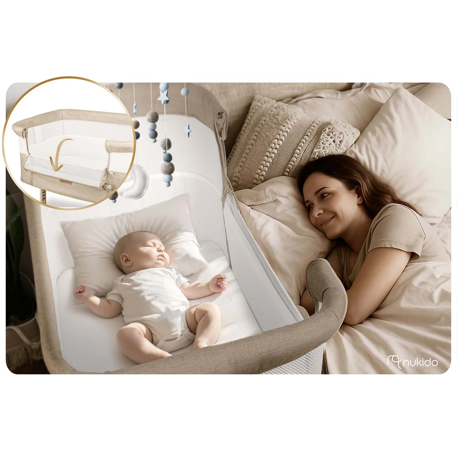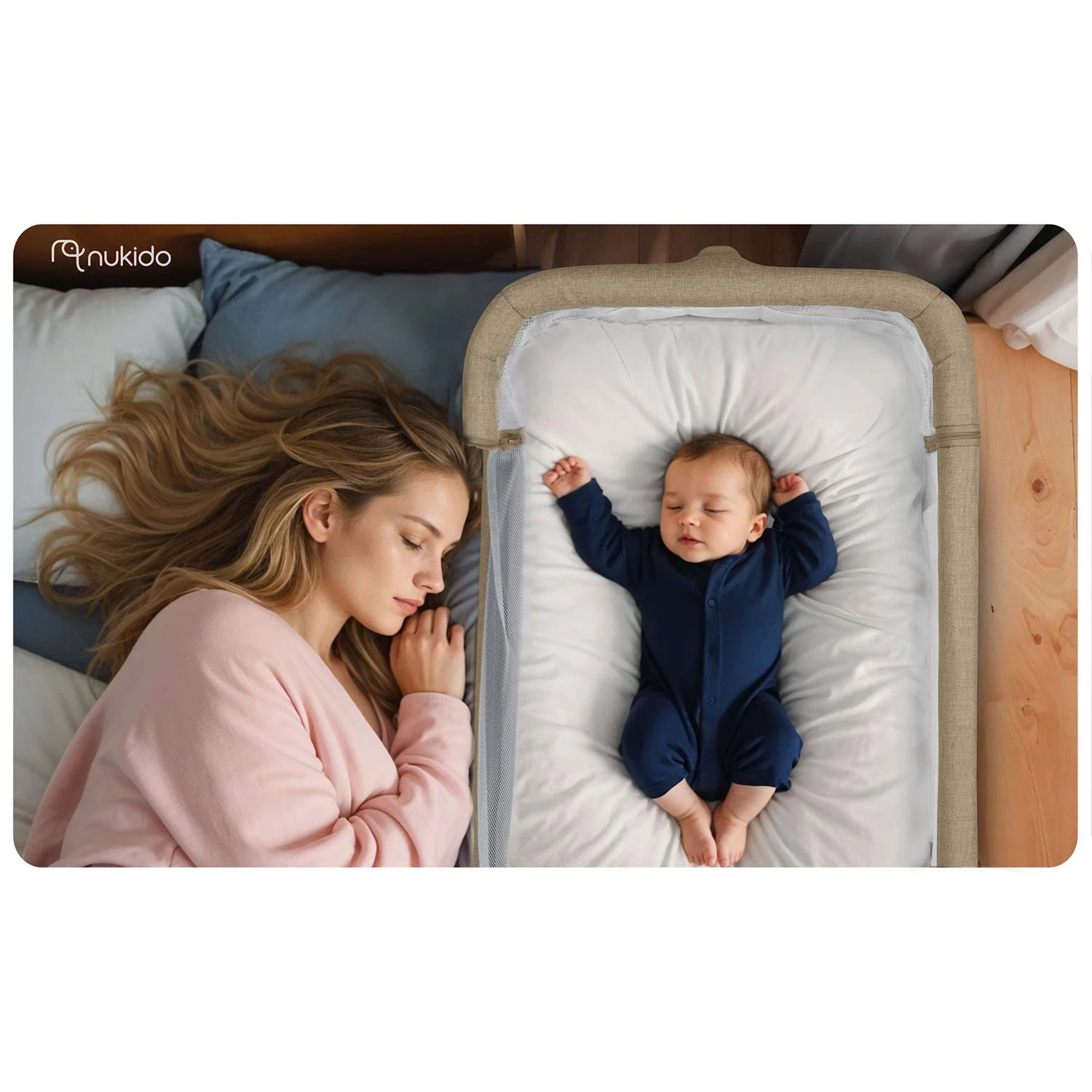 Łóżeczko dostawne sprawdzonej marki NUKIDO zapewnia dziecku bezpieczną przestrzeń do snu. Maluszek jest blisko rodziców, co ułatwia budowanie więzi i zapewnia poczucie bezpieczeństwa.