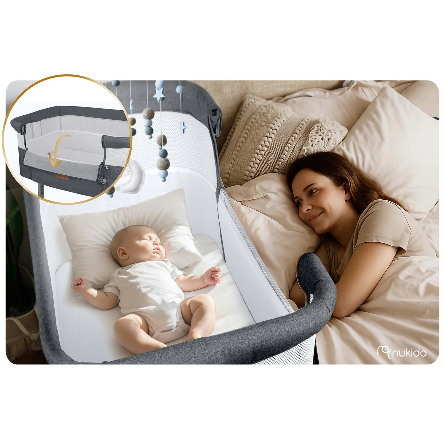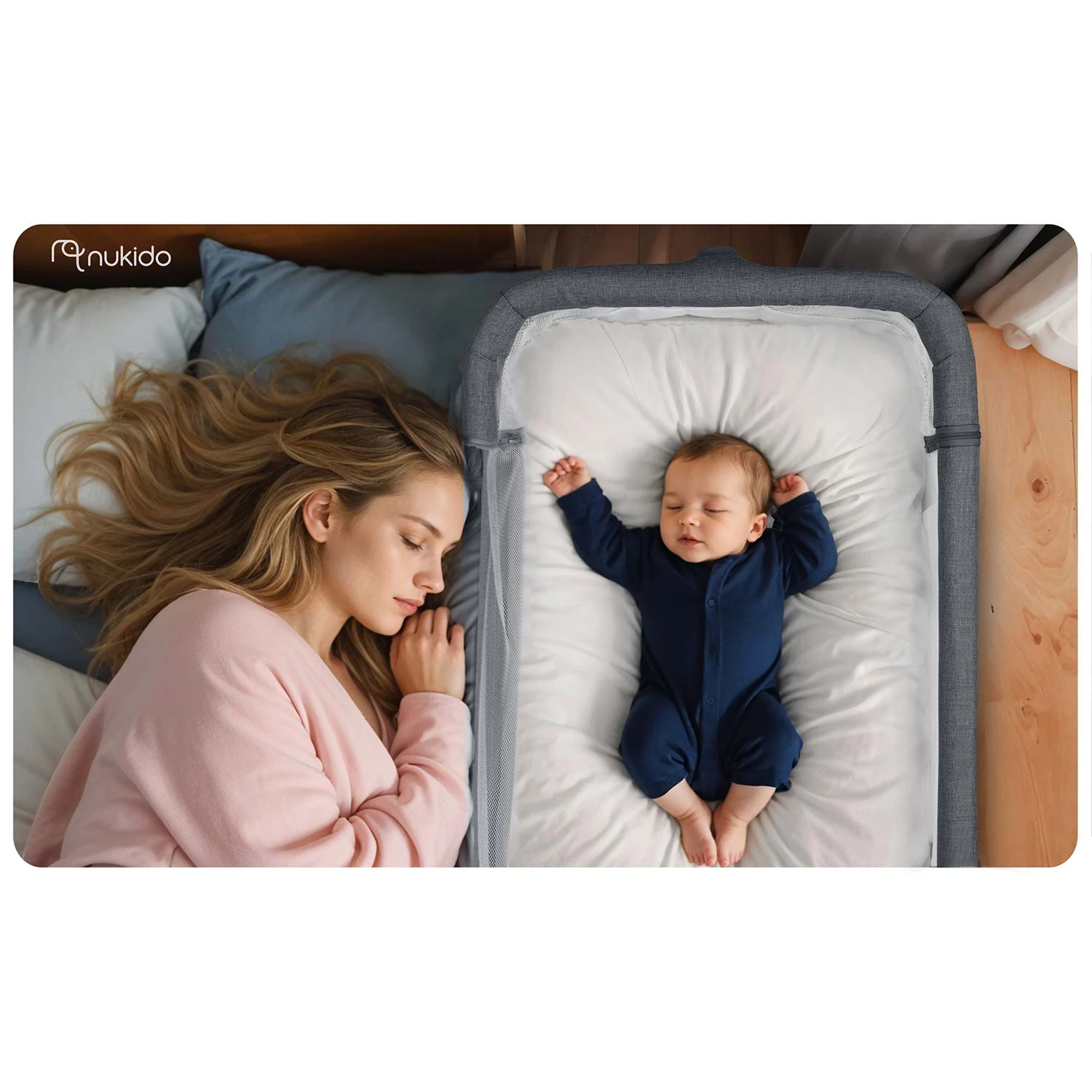 Łóżeczko dostawne sprawdzonej marki NUKIDO zapewnia dziecku bezpieczną przestrzeń do snu. Maluszek jest blisko rodziców, co ułatwia budowanie więzi i zapewnia poczucie bezpieczeństwa.