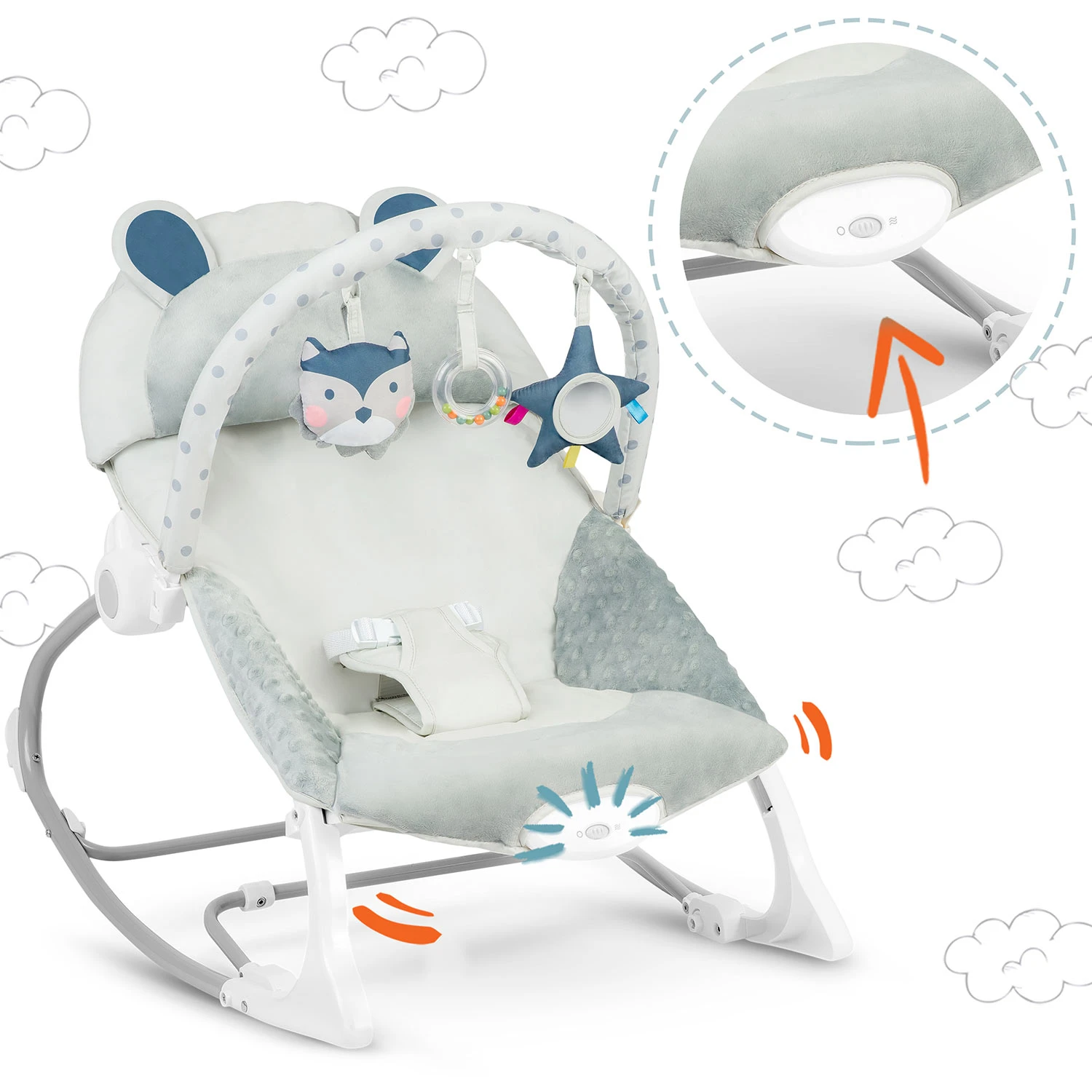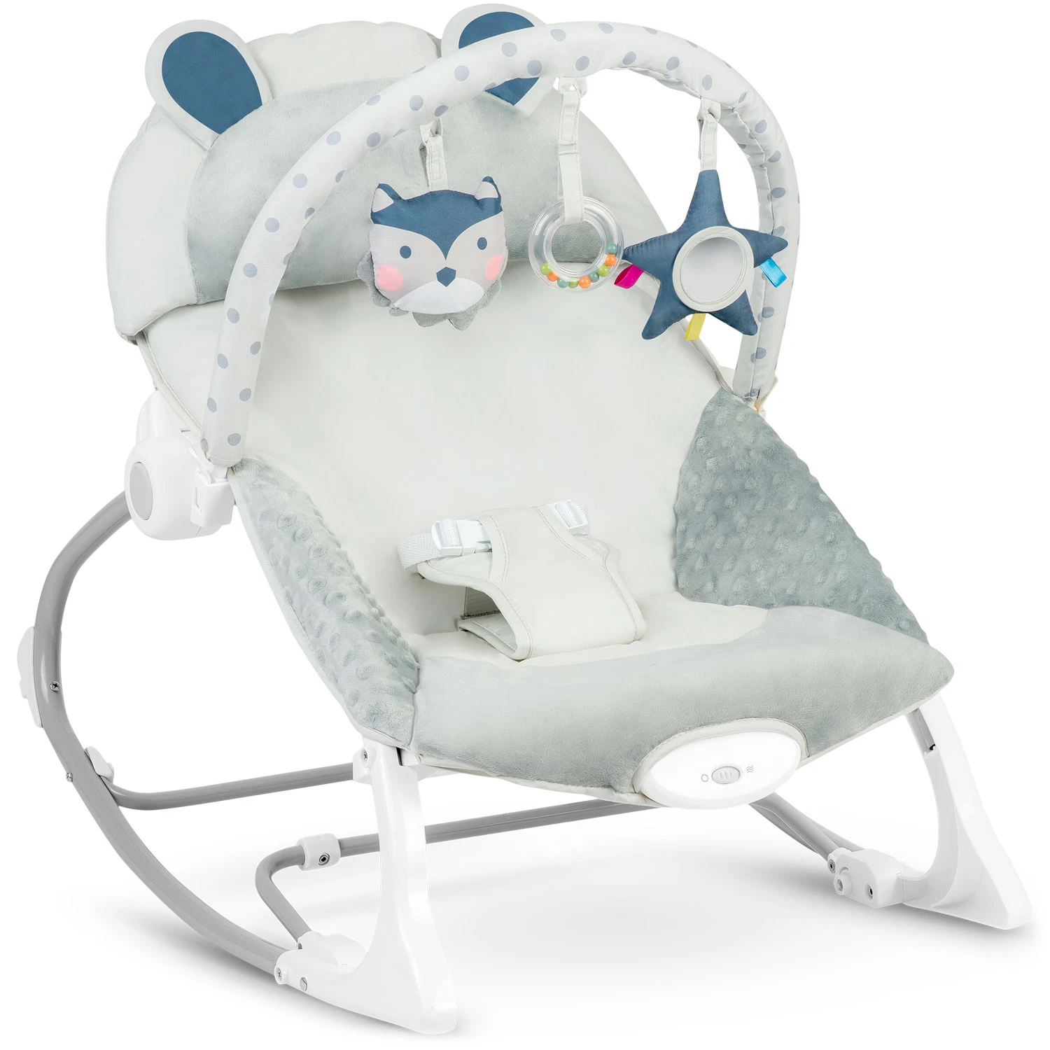 Leżaczek został wyposażony w zdejmowany pałąk z przyczepionymi szeleszczącymi zabawkami. Zapewnią one Twojemu dziecku rozrywkę, podczas gdy Ty będziesz mógł odpocząć. Te wyjątkowe zabawki stymulują wzrok oraz rozwijają zmysł dotyku.