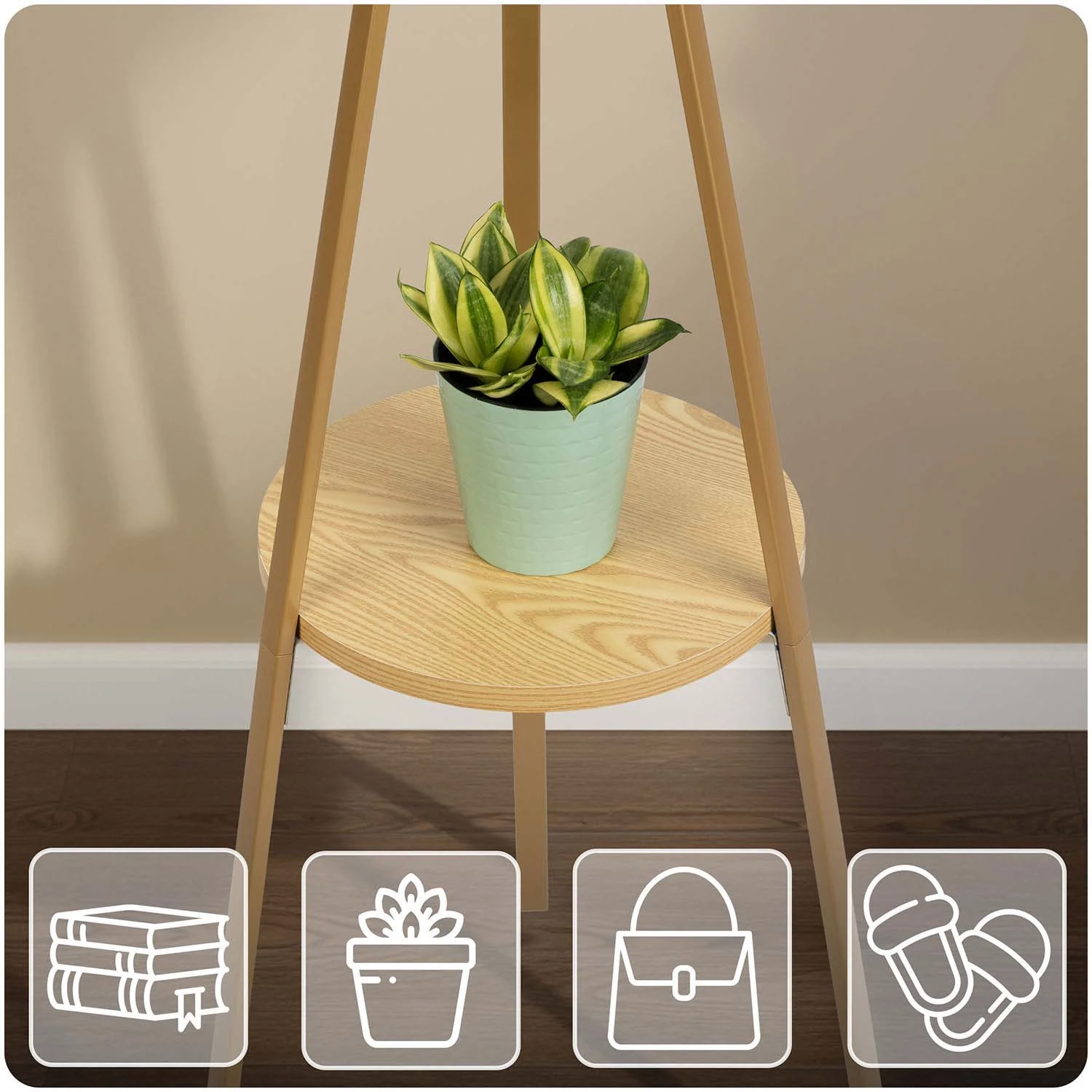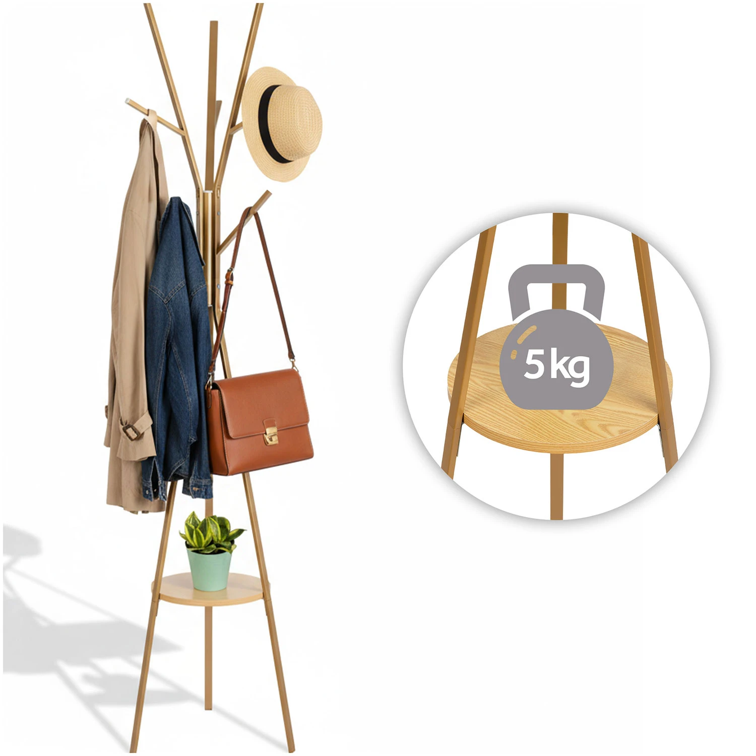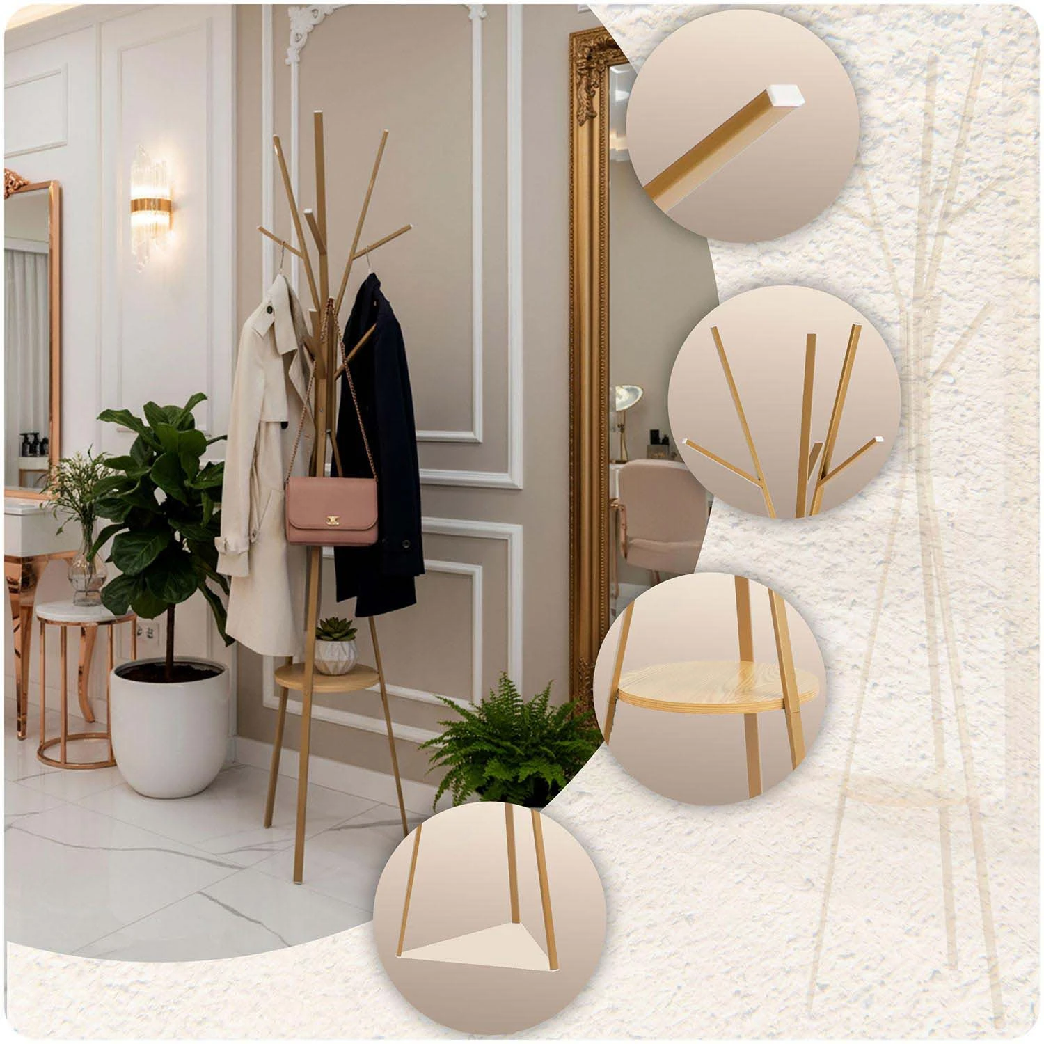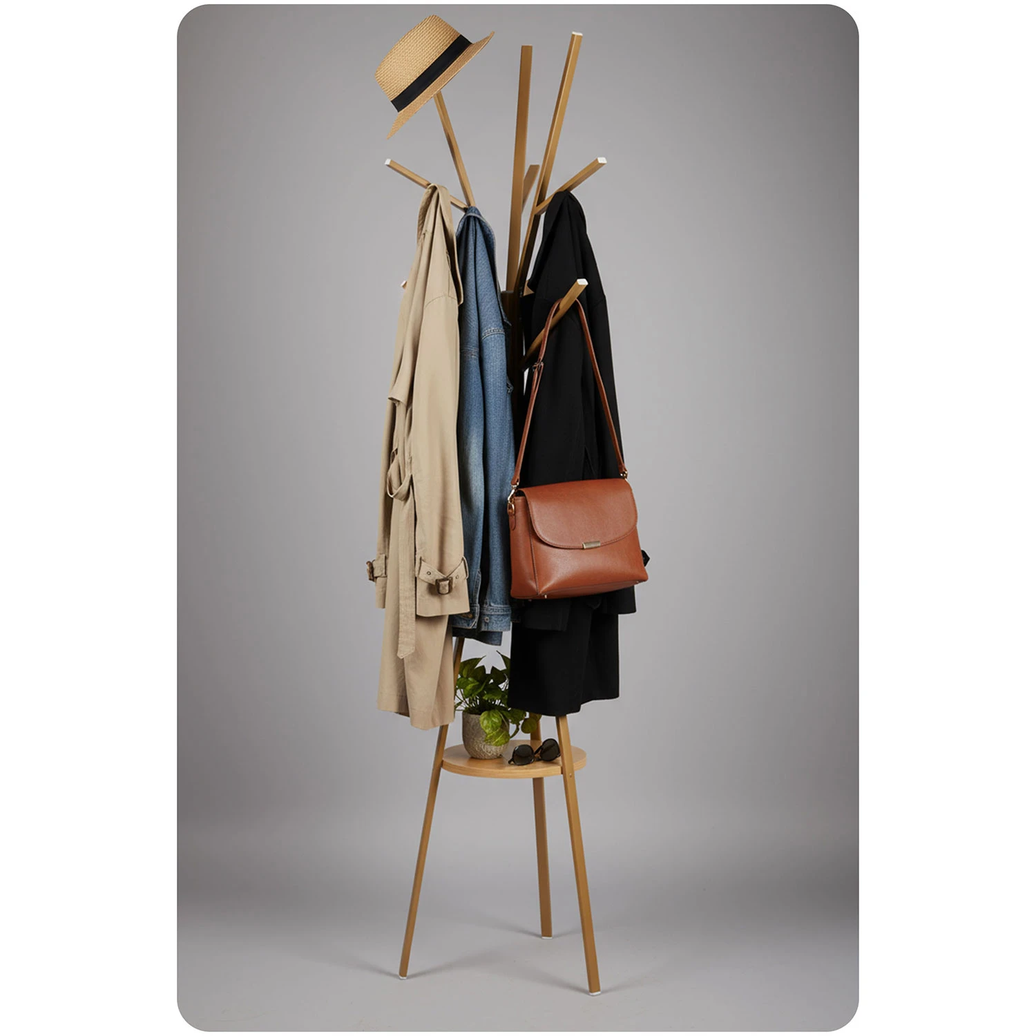 ✅ Prezentowany wieszak ma półkę na torby lub akcesoria.