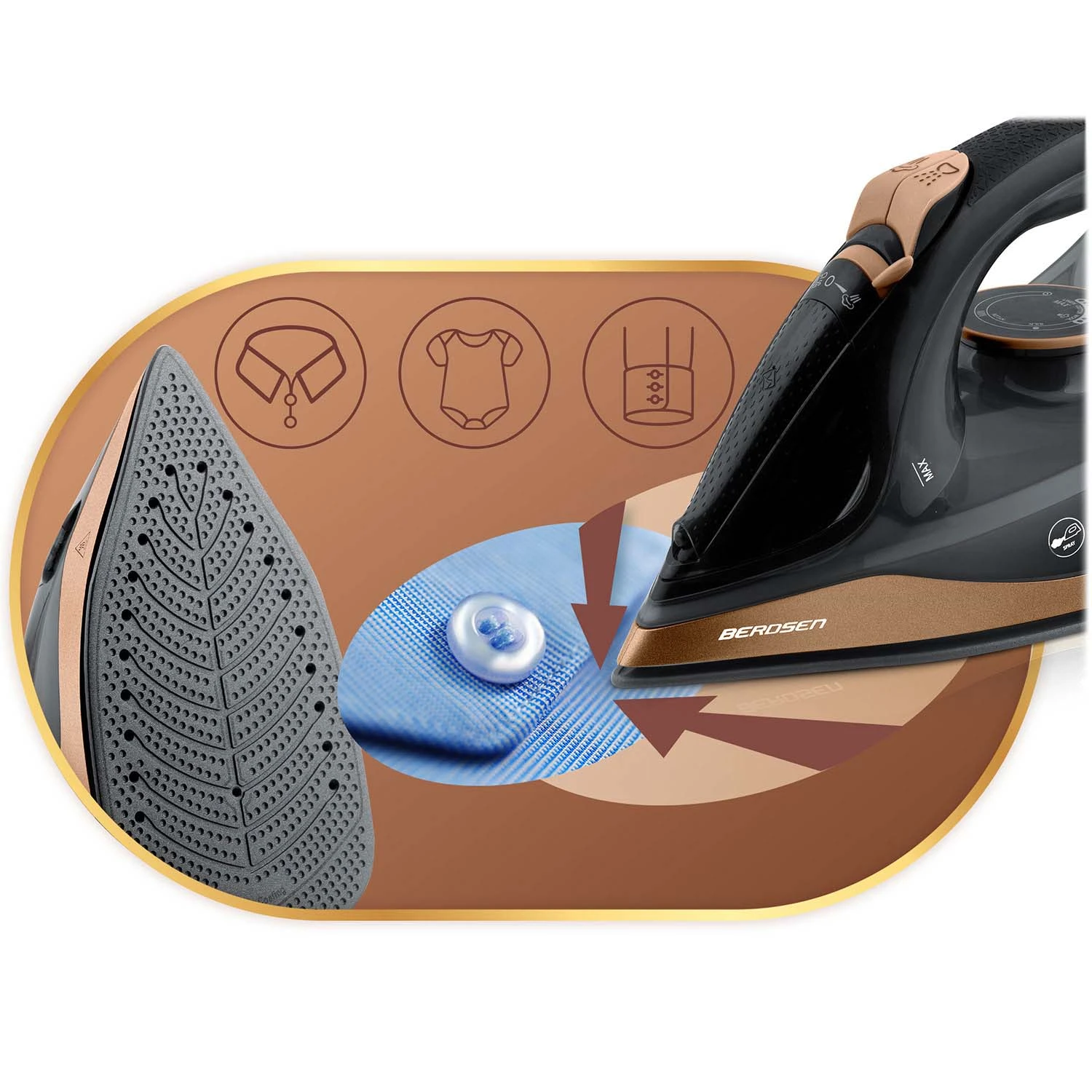 ✅ Ceramiczna stopa z mikrokanalikami – idealnie rozprowadza parę, dzięki czemu prasowanie jest szybsze i skuteczniejsze.