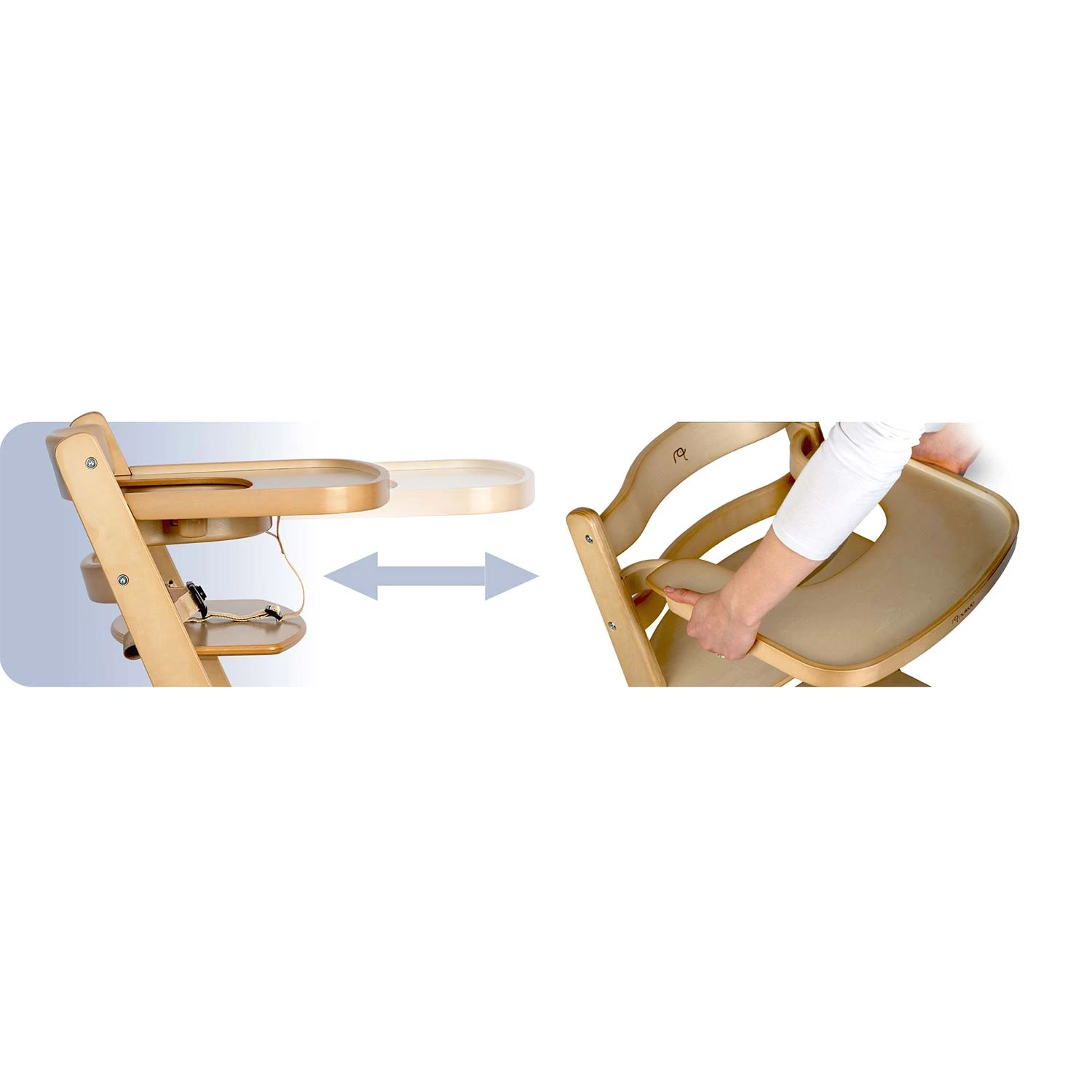 Zdejmowana tacka znacząco ułatwia utrzymanie czystości. Lakierowane drewno topolowe to gwarancja jakości. Zabezpieczone drewno nie pozwoli pochłonąć plam i krzesełko szybko wróci do perfekcyjnej czystości.