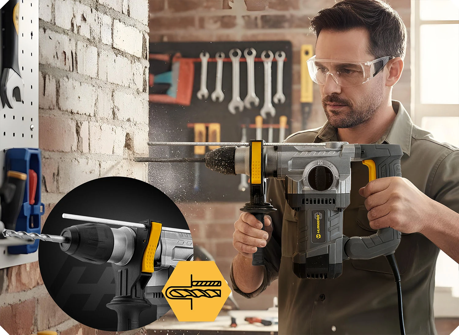 Ta młotowiertarka z ogranicznikiem głębokości to idealne narzędzie do precyzyjnego wiercenia w betonie, murze, drewnie i metalu. Ogranicznik pozwala ustawić dokładną głębokość wiercenia, co sprawia, że praca jest szybka, dokładna i powtarzalna – niezależnie od rodzaju zadania.